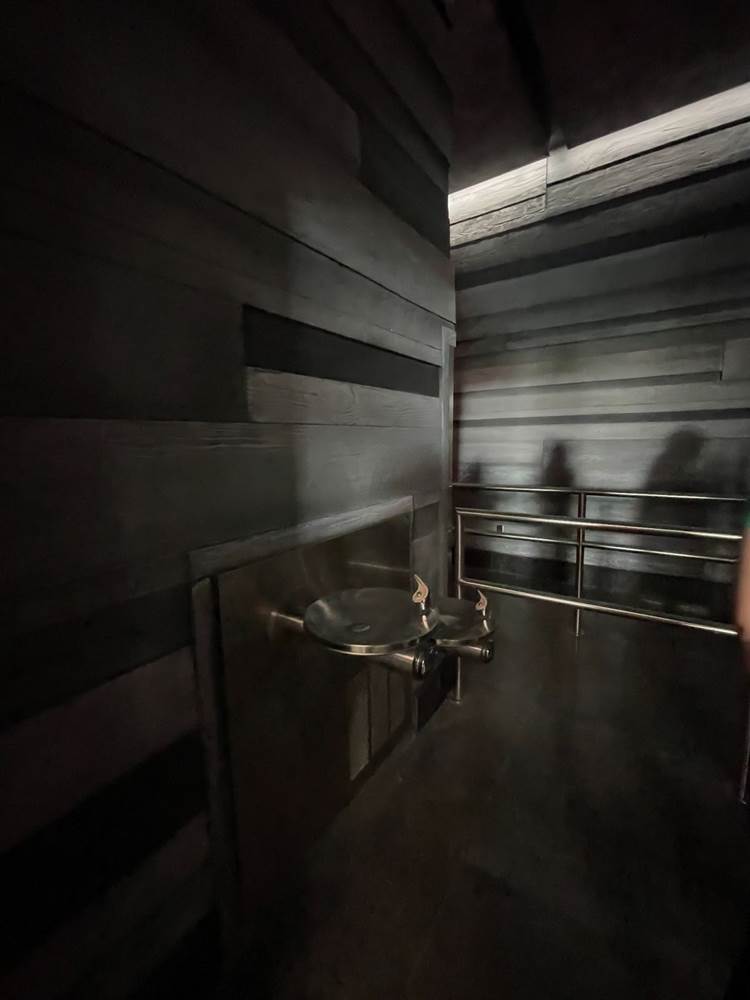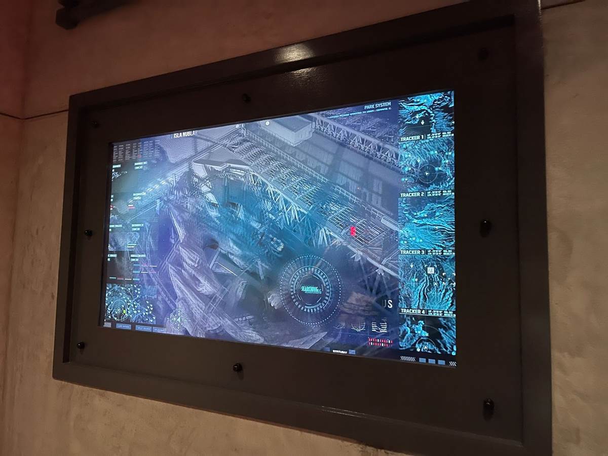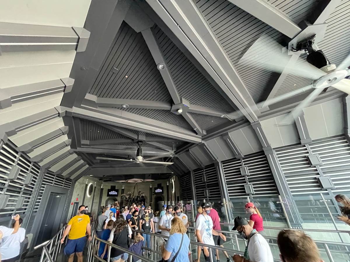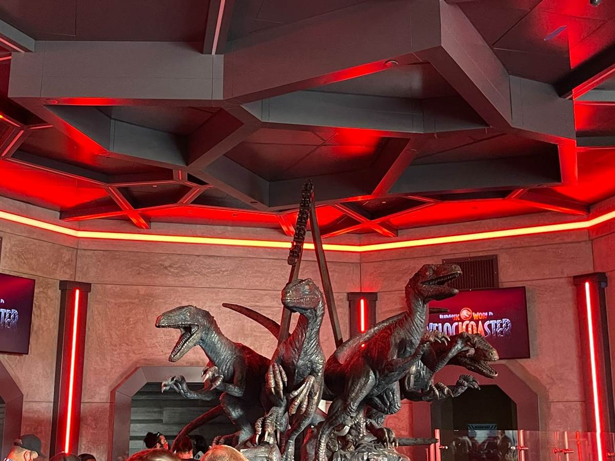 The queue features muzzled velociraptors that are clearly alive, blinking, snorting, and trying to break free of their restraints. There are also easter eggs hidden throughout, with books by both Dr. Ian Malcolm and Dr. Alan Grant featured in displays.
