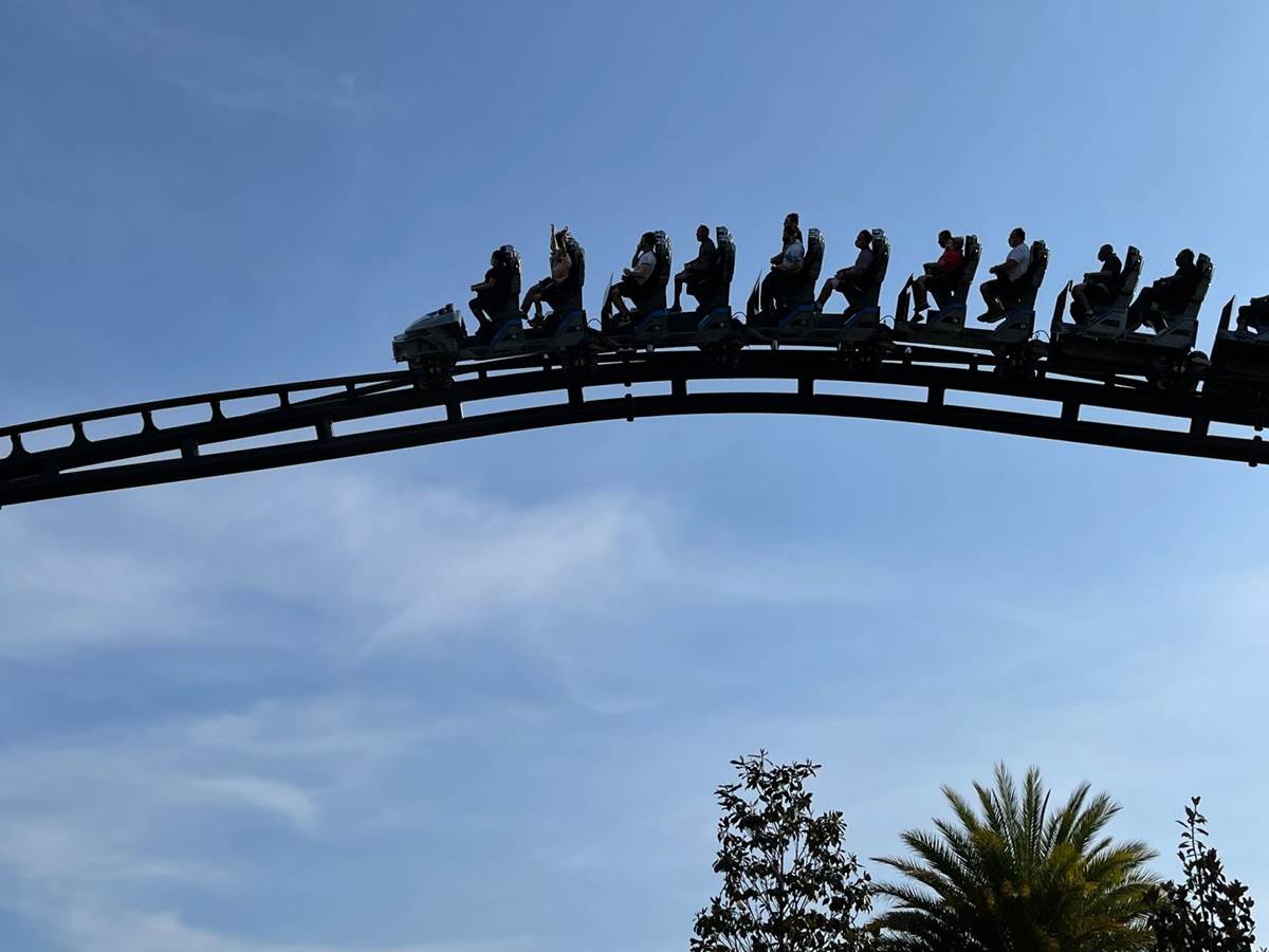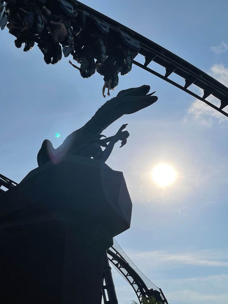 The new attraction is located on the landing in front of the Jurassic Park Discovery Center near the park’s show lagoon. The original cast from the Jurassic World movies – Chris Pratt, Bryce Dallas Howard and BD Wong – reprise their roles as Owen Grady, Claire Dearing and Dr. Henry Wu in the thrilling new attraction, which sends guests on an extreme adventure through the Raptor paddock and beyond with the films’ Velociraptor pack. Riders will scream through a series of unbelievable near-misses and maneuvers, including two high-speed launches – the fastest reaching 70 mph in 2.4 seconds – a total of 12 seconds of weightlessness, a barrel roll just inches above the Islands of Adventure lagoon and the signature “Top Hat,” which will send riders 155 feet in the air and then immediately into an 80-degree drop.