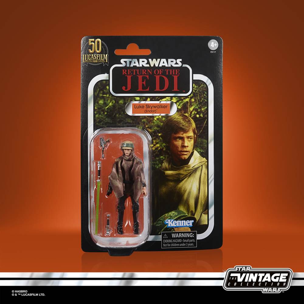 STAR WARS: THE VINTAGE COLLECTION LUCASFILM FIRST 50 YEARS 3.75-INCH LUKE SKYWALKER (ENDOR) (Summer) - “Commemorate the first 50 years of LUCASFILM with this figure, inspired by the original STAR WARS trilogy. Highly poseable with realistic detail, this figure features original Kenner branding and can be displayed in action figure and vehicle collections. Includes figure and 3 accessories.”
