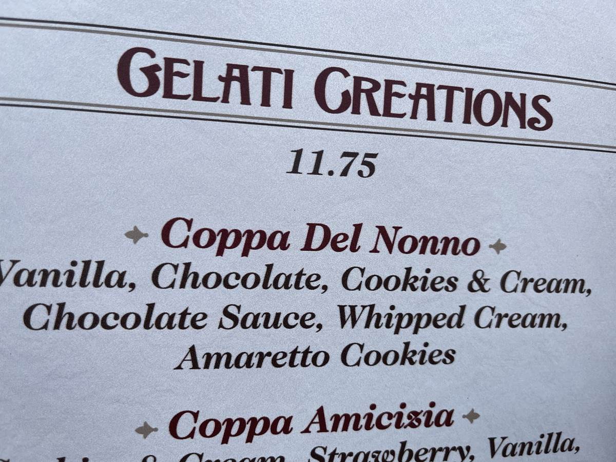 - Coppa del Nonno – Fior di Latte, chocolate, and cookies ‘n cream gelati with chocolate sauce, whipped cream, and amaretti cookies