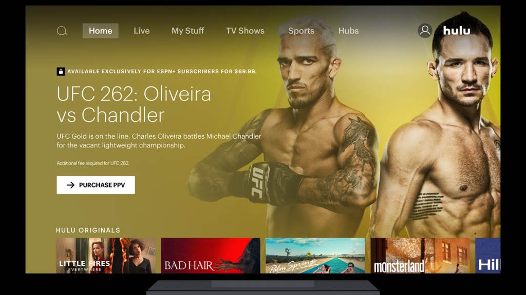 - Starting today, ESPN+ elevates the sports experience for Hulu viewers by adding UFC pay-per-view events to ESPN+ on Hulu. Fans subscribed to either The Disney Bundle or the ESPN+ on Hulu add-on can purchase pay-per-view events directly in the Hulu app, starting with UFC 262 next Saturday, May 15.