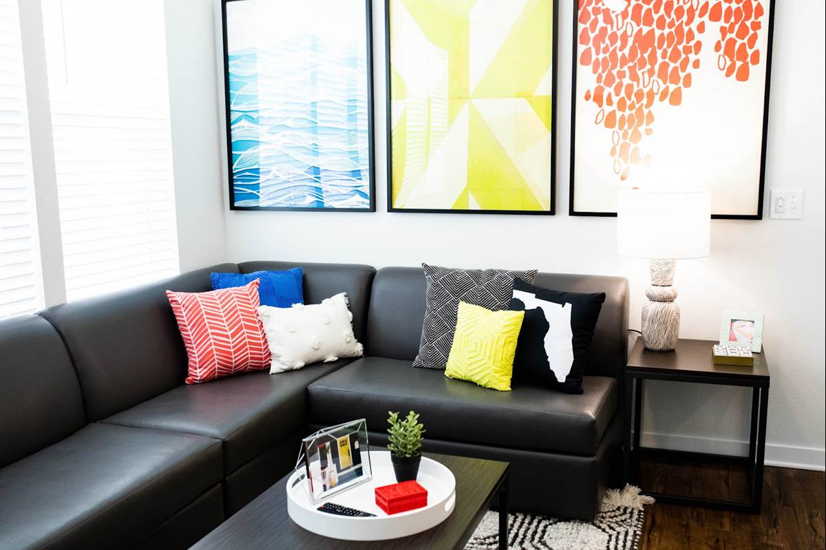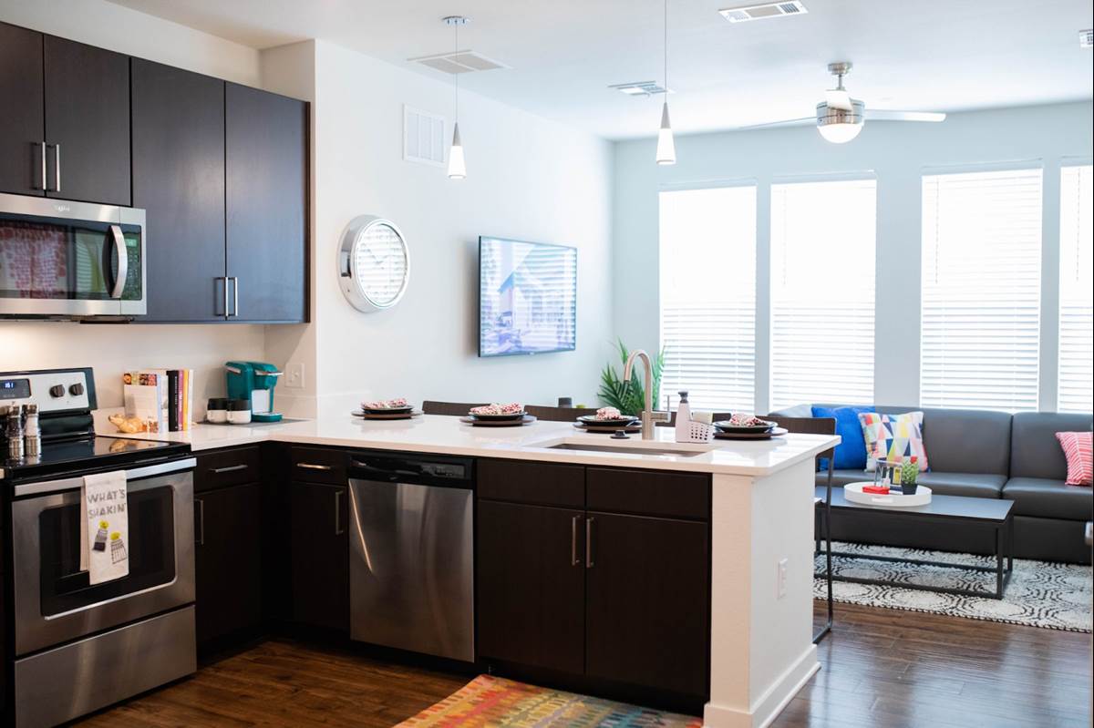 - They all feature hardwood-style floors, a washer and dryer, a smart TV, and furniture including beds, couches, tables, chairs, and more. The kitchen comes with plates, utensils, cookware, and glassware.