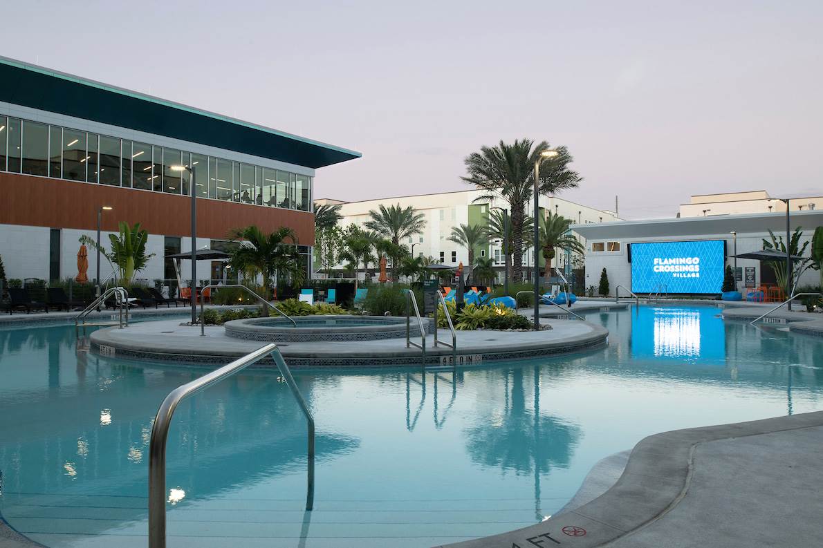- Flamingo Crossing Village will have various ways participants can relax including walk-in pools, 24/7 fitness center, athletic courts, and grilling stations.