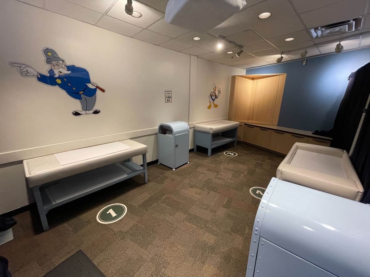 A changing table area is decorated with a few characters, including Donald Duck and a keystone police officer.