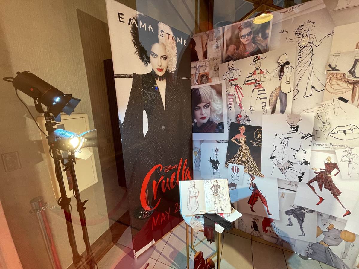 - While the film still has yet to debut, we can tell some aspects of these displays come straight from a scene in the film (that we know from the trailer) where Cruella and different words are projected onto the side of a building. This aesthetic seems to be carried over into the doorways of the cinema, and even projected onto the exterior wall.