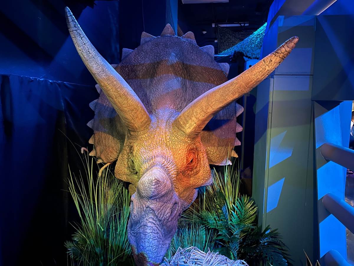 The final room holds all the food offerings and a Triceratops who could probably go for some of that Dino Chow.