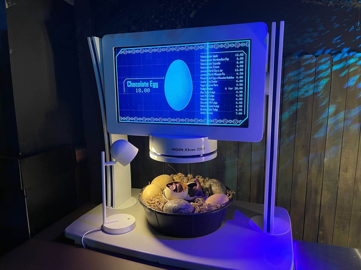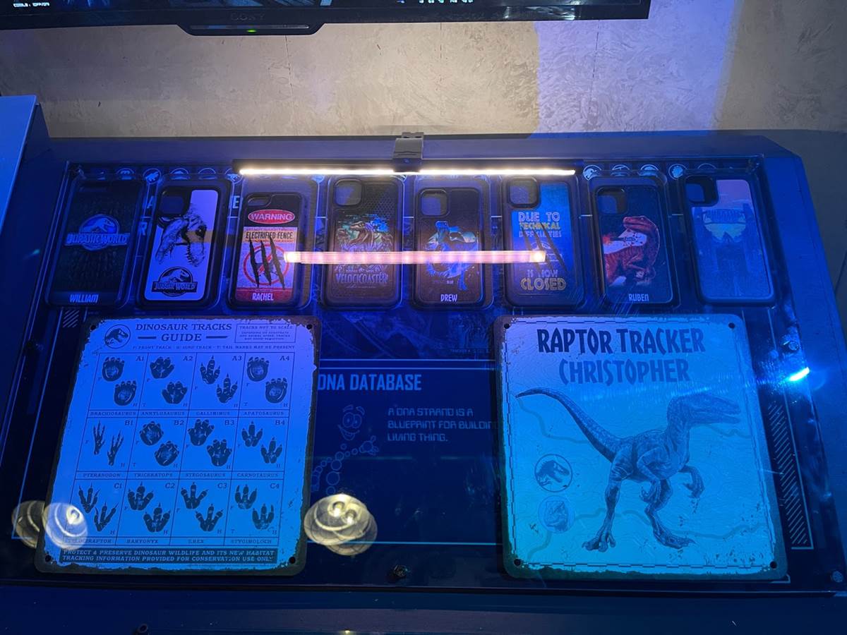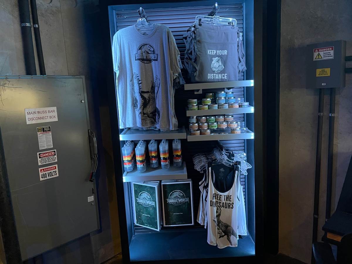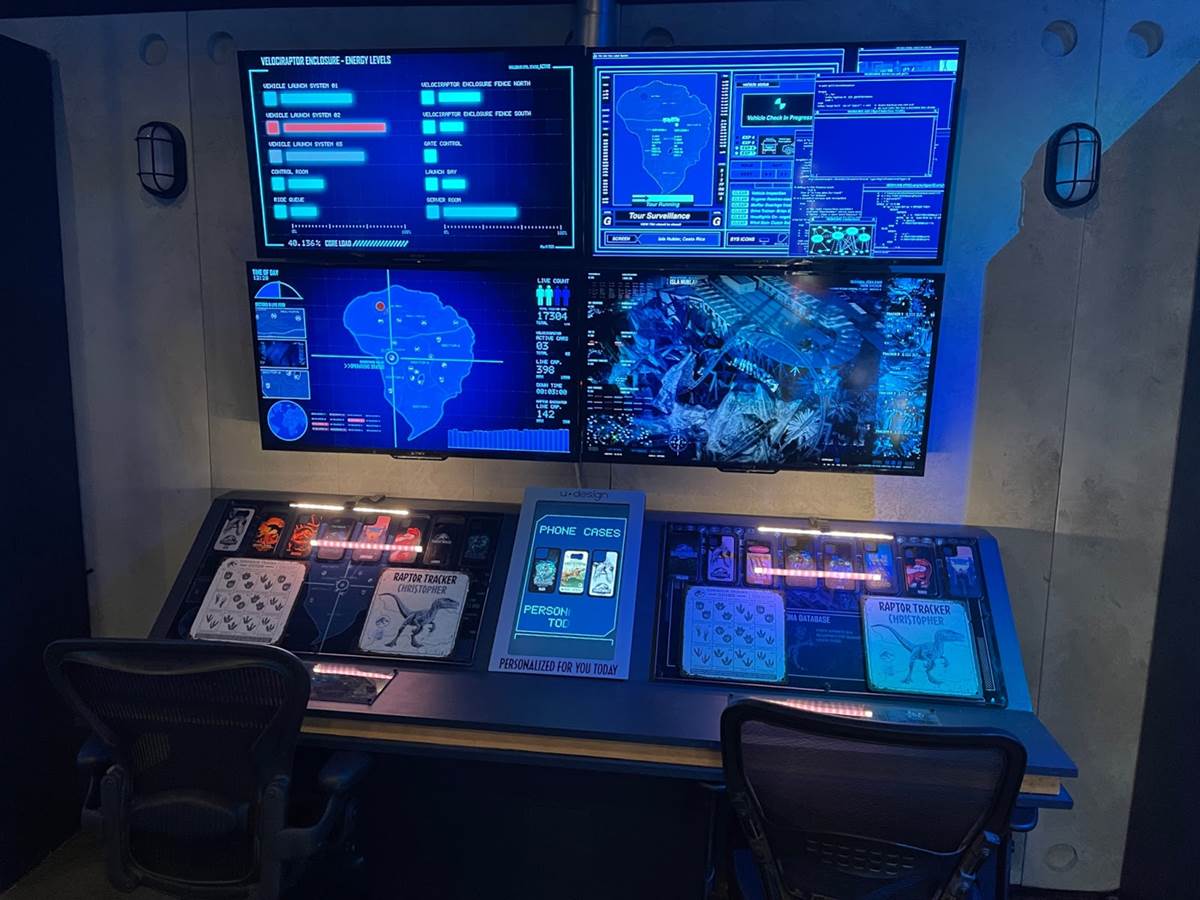 On the security screens, you can check out some footage from the new attraction. Right under the security displays are Jurassic World-themed phone cases and wall signs available to design and purchase.