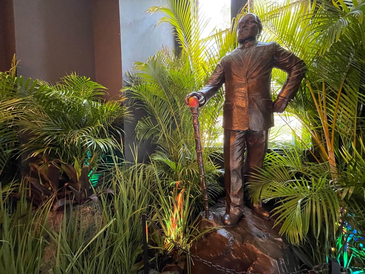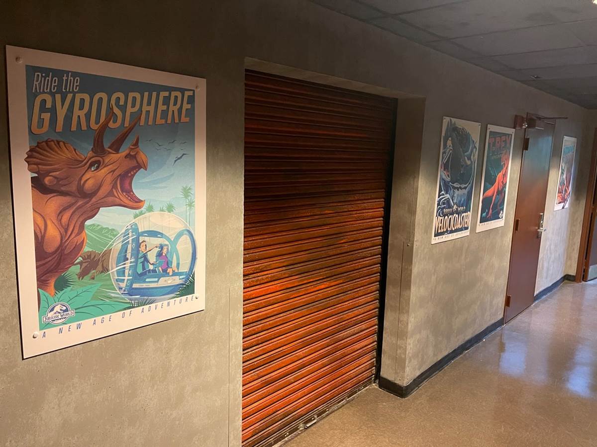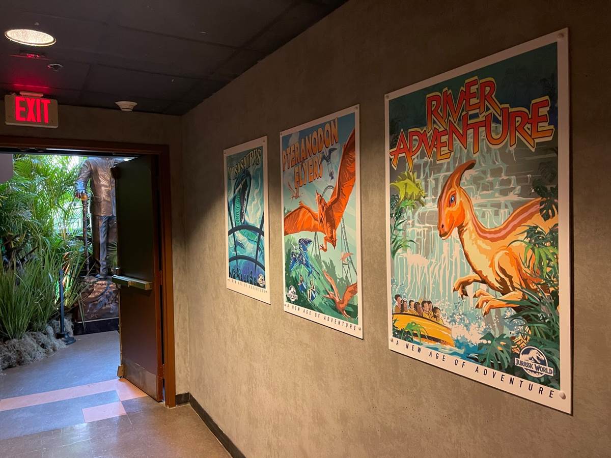 Retro posters and a statue of John Hammond are featured at the exit of the tribute store.