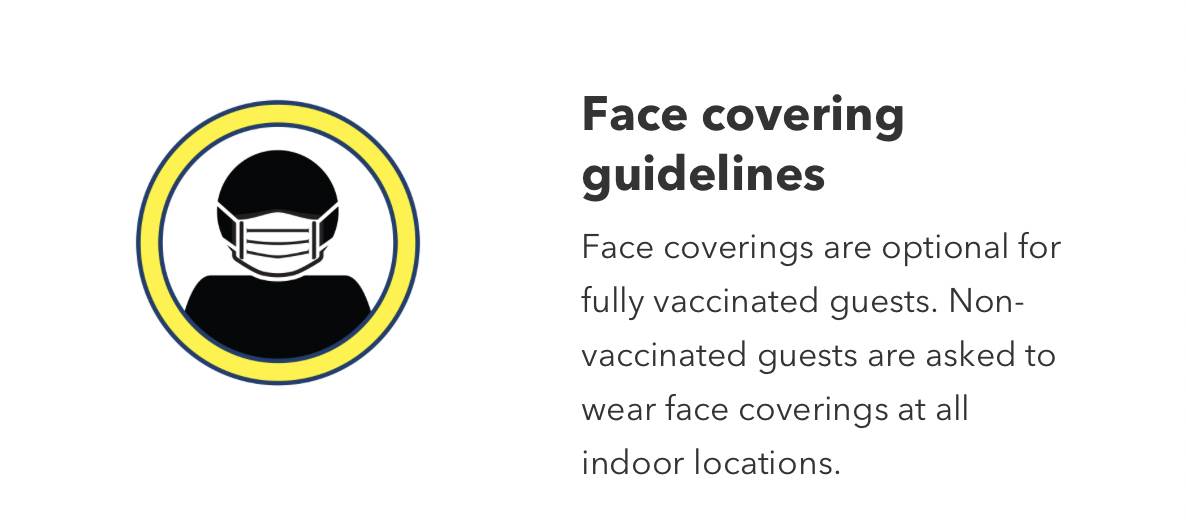- “In accordance with CDC guidelines, face coverings are no longer required for fully vaccinated guests, indoors or outdoors. While we do not require proof of vaccination, we do expect those who are not fully vaccinated to wear face coverings while indoors. We encourage all guests to keep a safe distance between travel parties, and we remain focused on maintaining the highest cleanliness and sanitization standards.”