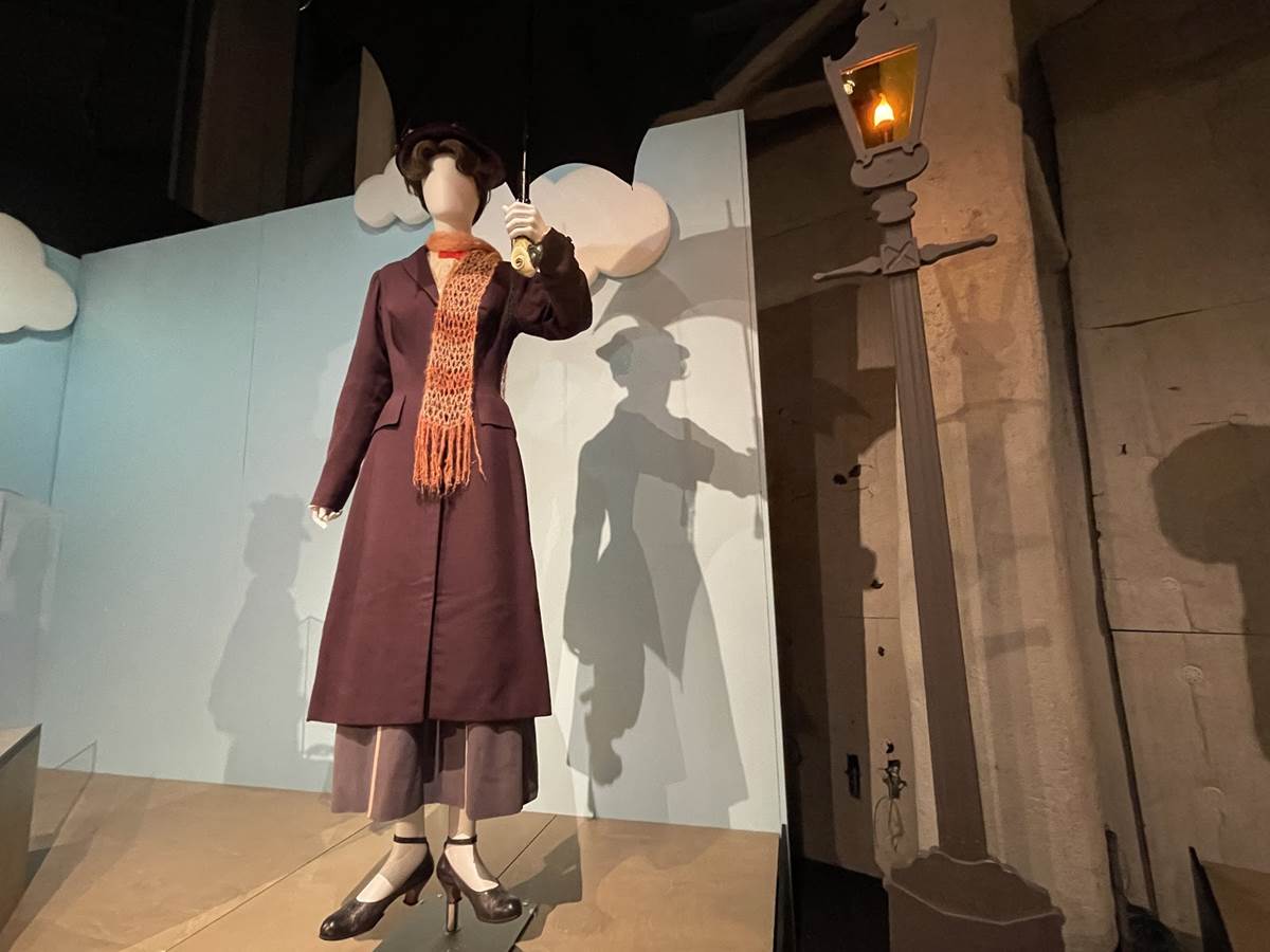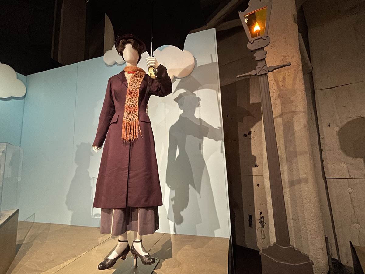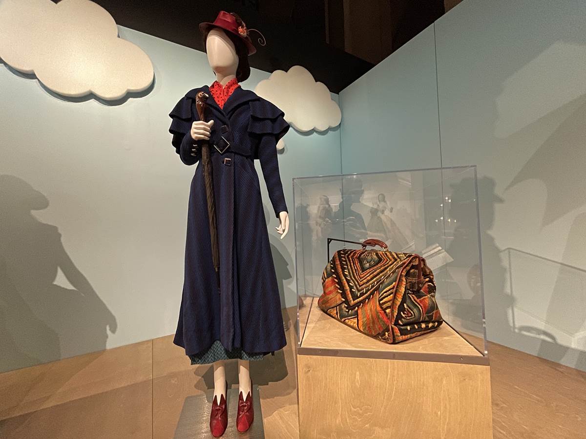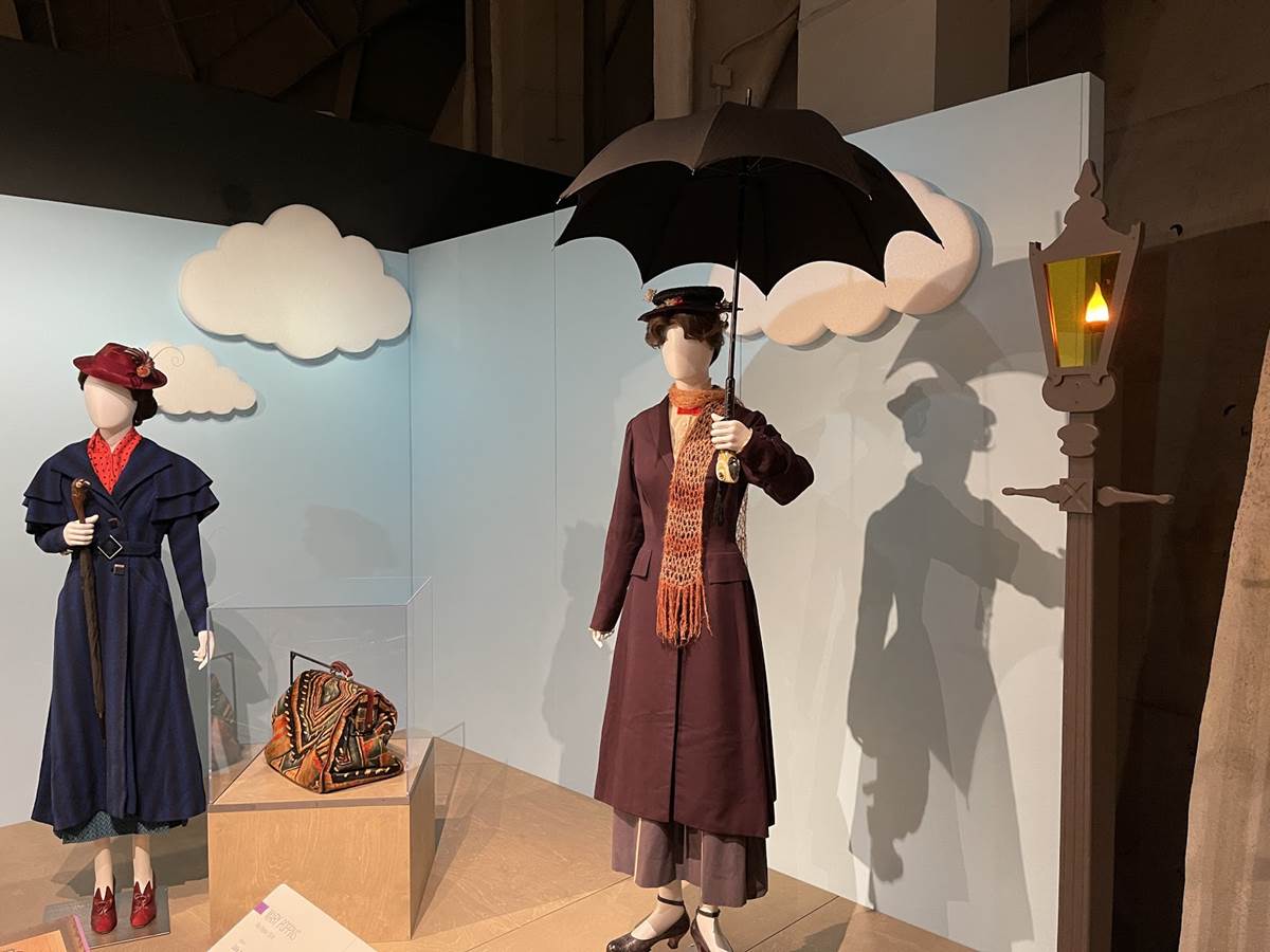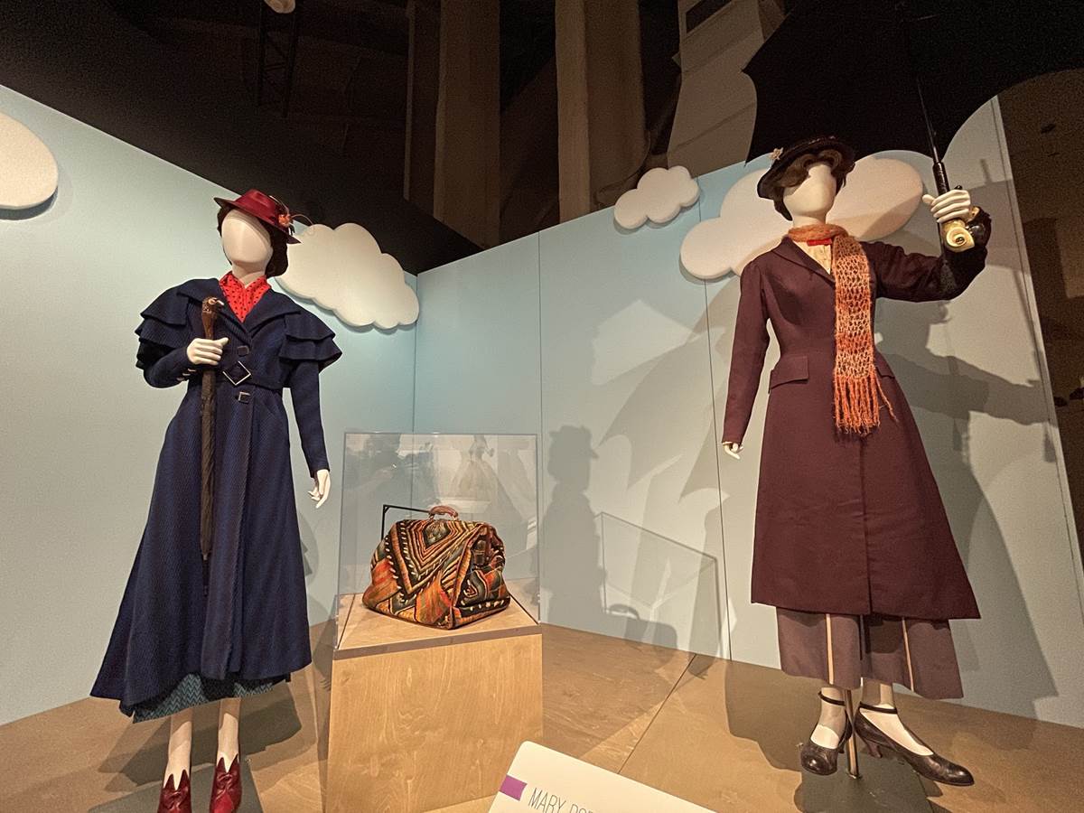 The oldest costume on display is Mary Poppins’ traveling dress designed by Bill Thomas and worn by Julie Andrews in the 1964 film. It is paired with the traveling dress designed by Sandy Powell and worn by Emily Blunt in 2018’s Mary Poppins Returns.