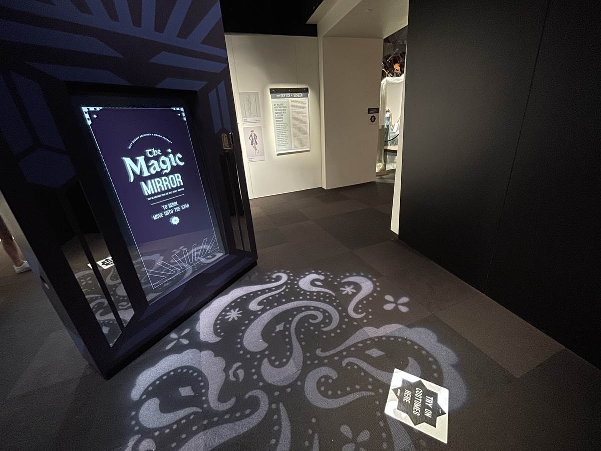 The exhibit features two interactive activities. A “Magic Mirror” that is inspired by Snow White and the Seven Dwarfs and designed by MoPOP allows visitors to virtually “try on” several of the costumes featured in the exhibition. The mirror uses touchless technology and a depth camera to sense visitors as they approach and shows them how they might look as Cinderella, Jack Sparrow, or Mary Poppins. “Getting into Character” is an interactive projection that allows visitors to explore the materials, colors, textures, and forms that costume designers use to help define a character. Guests “step into” an area where a projector detects their presence and an animated collage of materials, colors, textures, and/or patterns used to define a particular character are displayed along with information explaining the character and costume design.