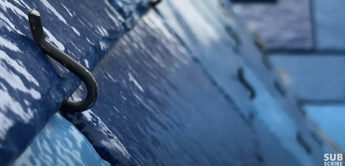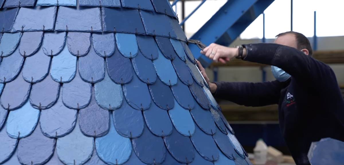 - The painted slate tiles on the castle are installed using a hook system as they are cut by hand and painted one by one.