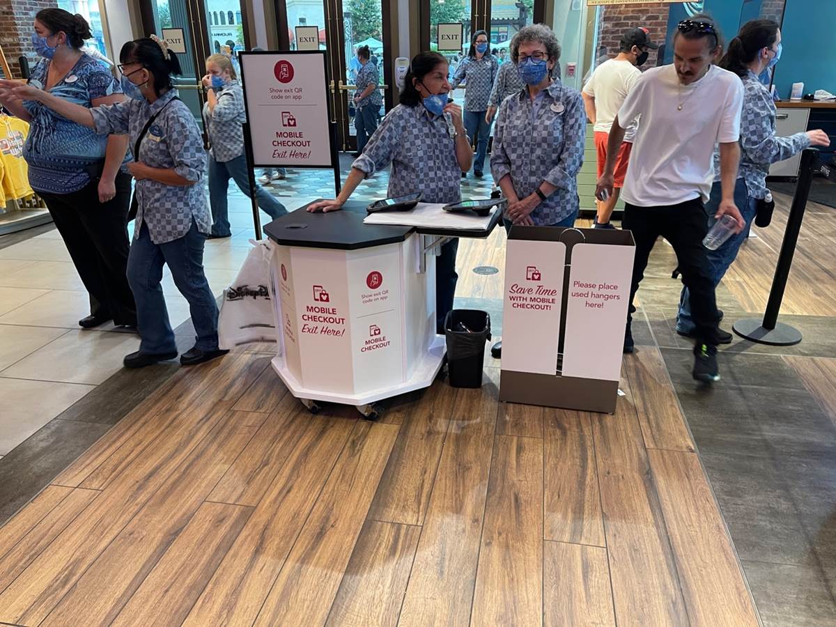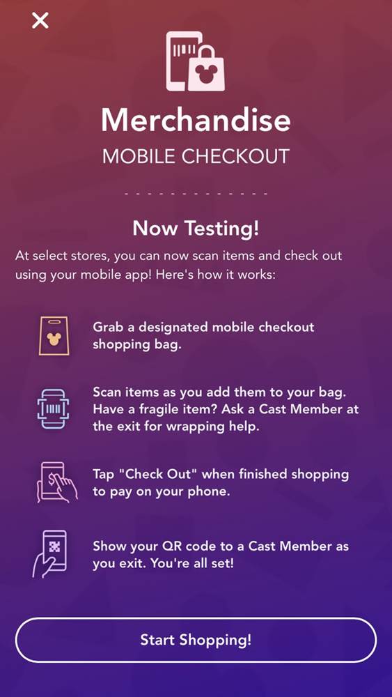 - Mobile Checkout allows Guests to place everything they are wanting to buy in clear plastic bags while scanning the item’s barcode via the My Disney Experience app.