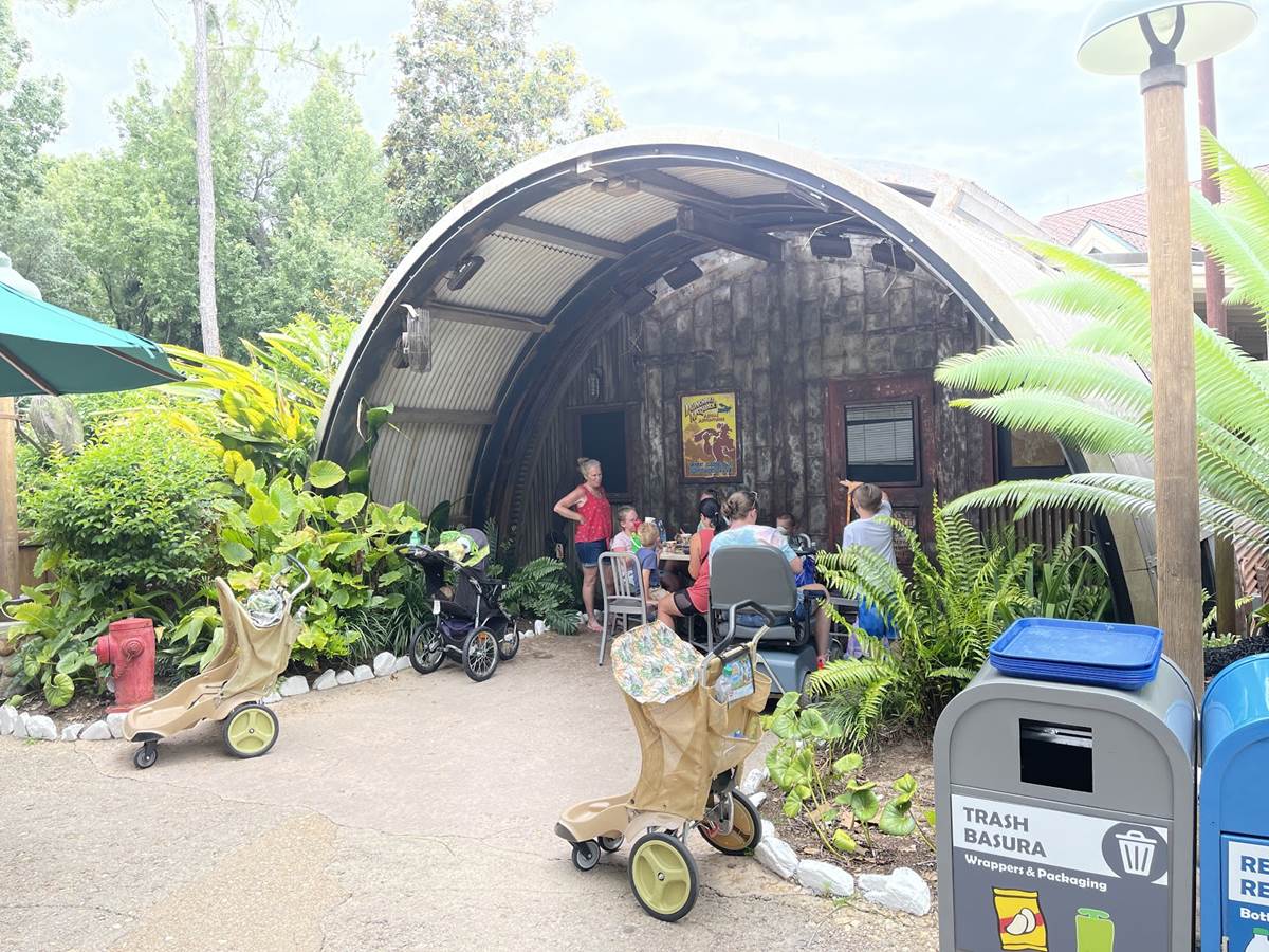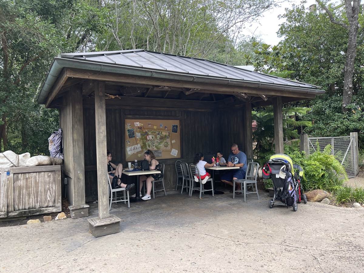 Elsewhere in the land, park fans may recall that as part of Dinoland’s Donald’s Dino-Bash festivities, character meet and greets with Scrooge McDuck and Launchpad McQuack were placed in the land. The meet and greets were so successful that more permanent staging complete with sets and props were installed in their respective locations. Today, we noticed that all those designs had been removed and tables and chairs now occupy the area, signifying that once character meet and greets are prominent again, we likely won’t see the two duck friends in the land. Signage for Donald’s Dino Bash is still evident throughout the land, but the removal of these two particular characters might also be due to the end of the DuckTales reboot on Disney XD.