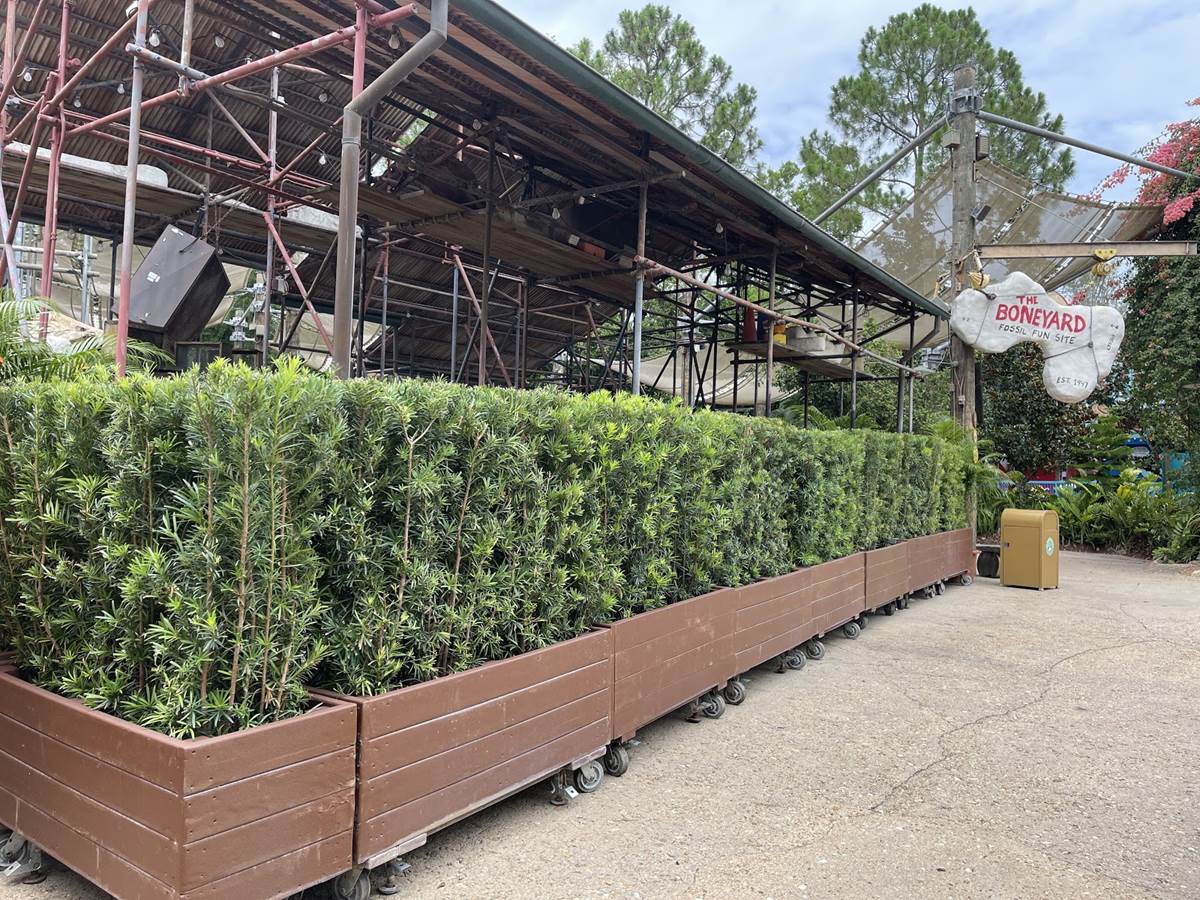 As we entered the land we realized that there are some changes afoot at The Boneyard. While the land’s playground and fossil dig have been closed to guests since the parks reopened last July, the attraction was never covered up as it is today. Where once ropes and a cast member or two once protected the area from curious guests, now sits a wall of moveable planter boxes barricading the area.