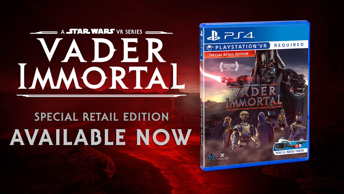 - ILMxLAB’s award-winning Vader Immortal has officially hit store shelves for PlayStationVR today. In collaboration with publisher Perp Games, the Vader Immortal special retail edition includes Episodes I, II, and III along with a host of extra goodies for Star Wars fans. The special edition is available in America and Europe for the suggested retail price of $22.99 and £24.99 in the United Kingdom. Major American retailers include Amazon, Best Buy, GameStop and Target.