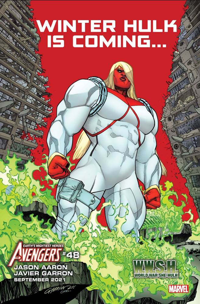 Winter Hulk is coming. WORLD WAR SHE-HULK, the upcoming arc in Jason Aaron and Javier Garrón’s action-packed run on AVENGERS will continue into September with AVENGERS #48!