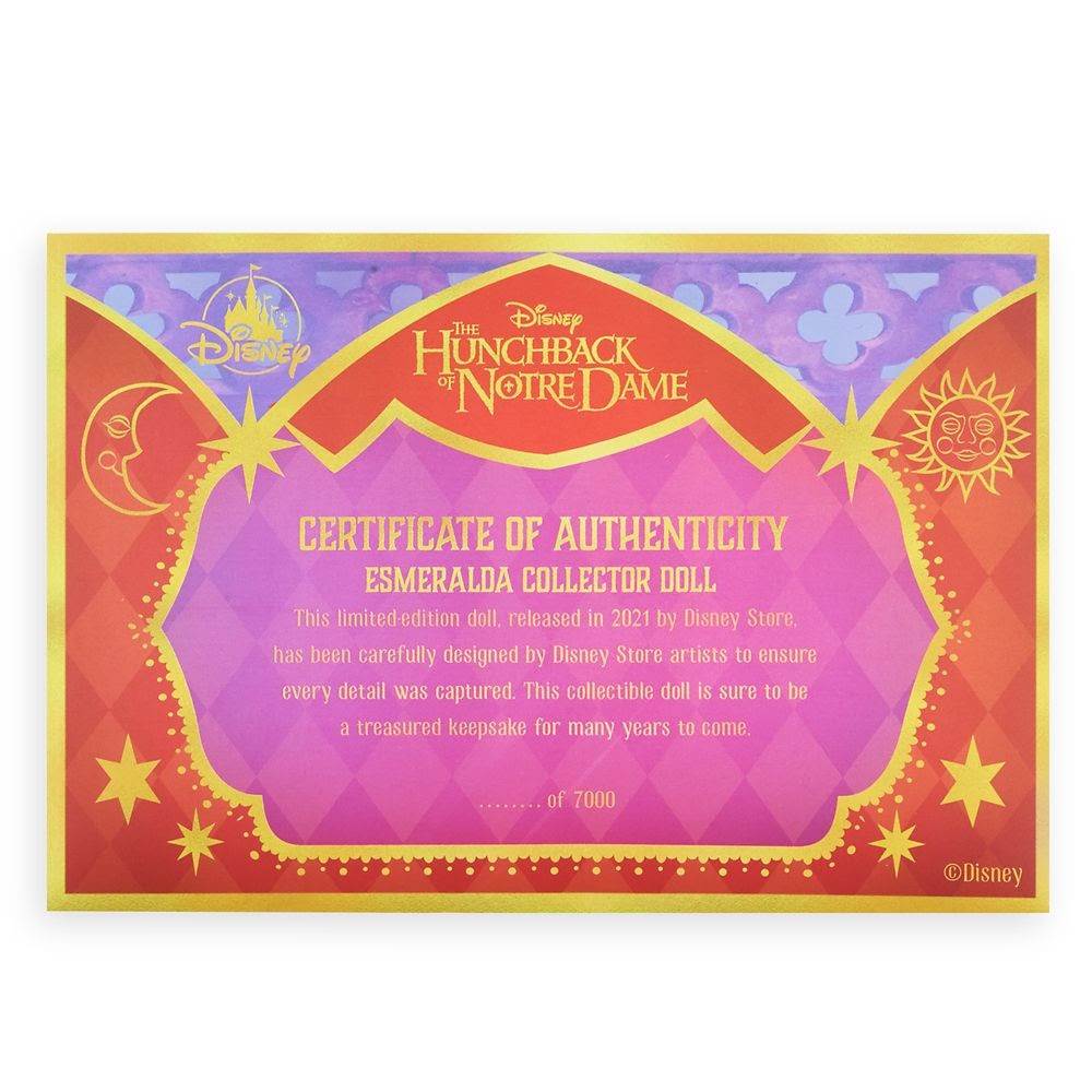 - This collectible features Esmeralda in her traditional gypsy dress which is embellished with gold sequins, intricate hemlines, and turquoise gems.
