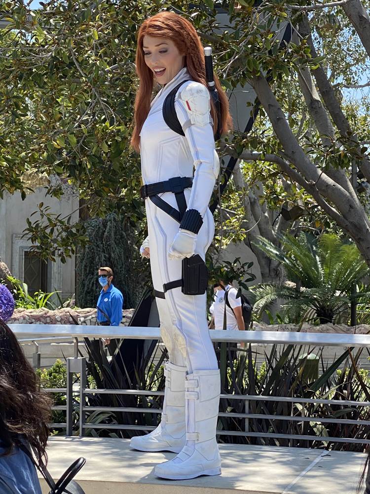 - The Disney Parks Blog shared a look at Black Widow sporting her new white snow suit, which she will don in the upcoming movie.