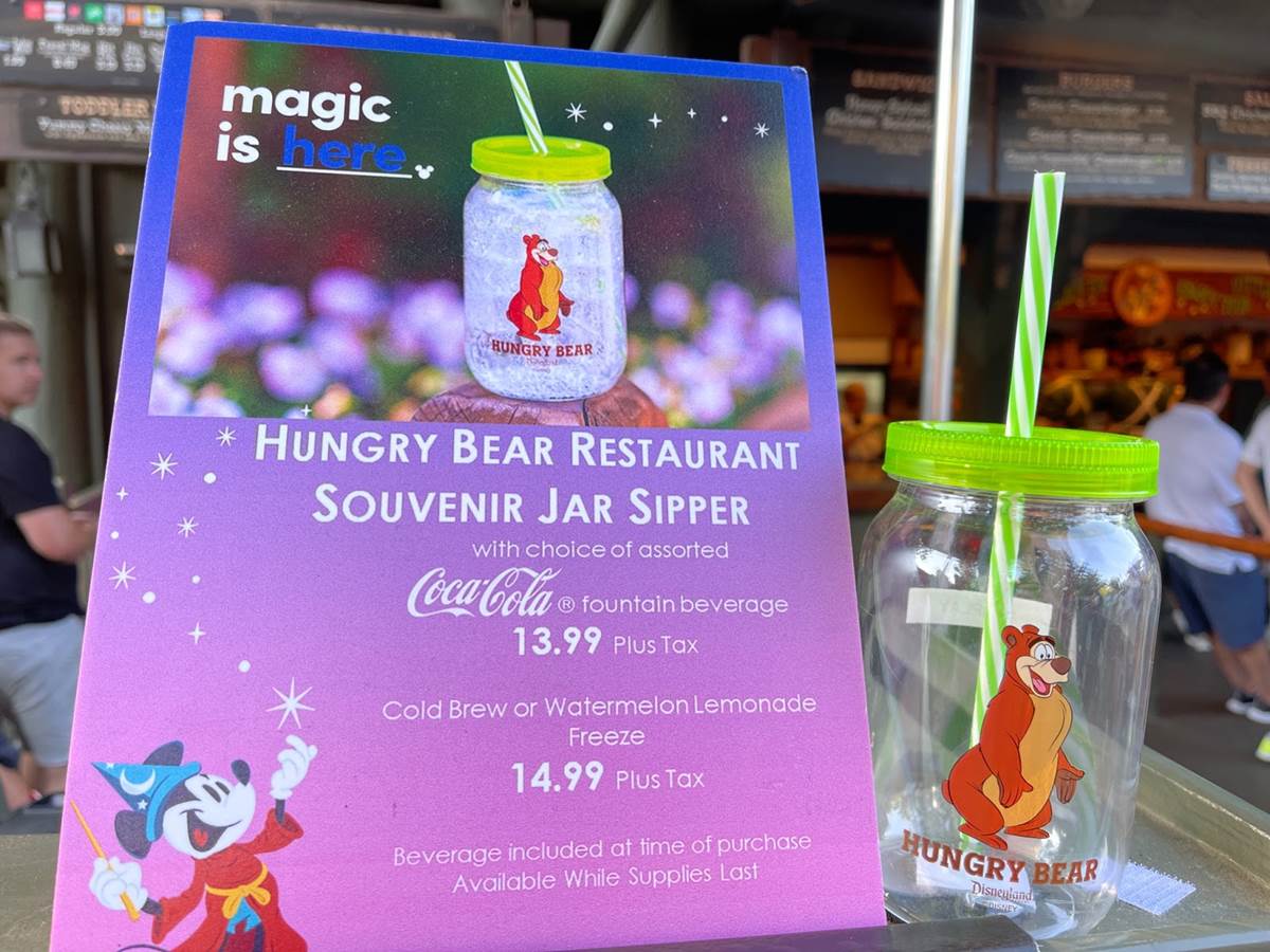 The Hungry Bear Restaurant Souvenir Jar Sipper comes with your choice of fountain beverage for $13.99. You can also upgrade to a Cold Brew or Watermelon Lemonade Freeze for $14.99.