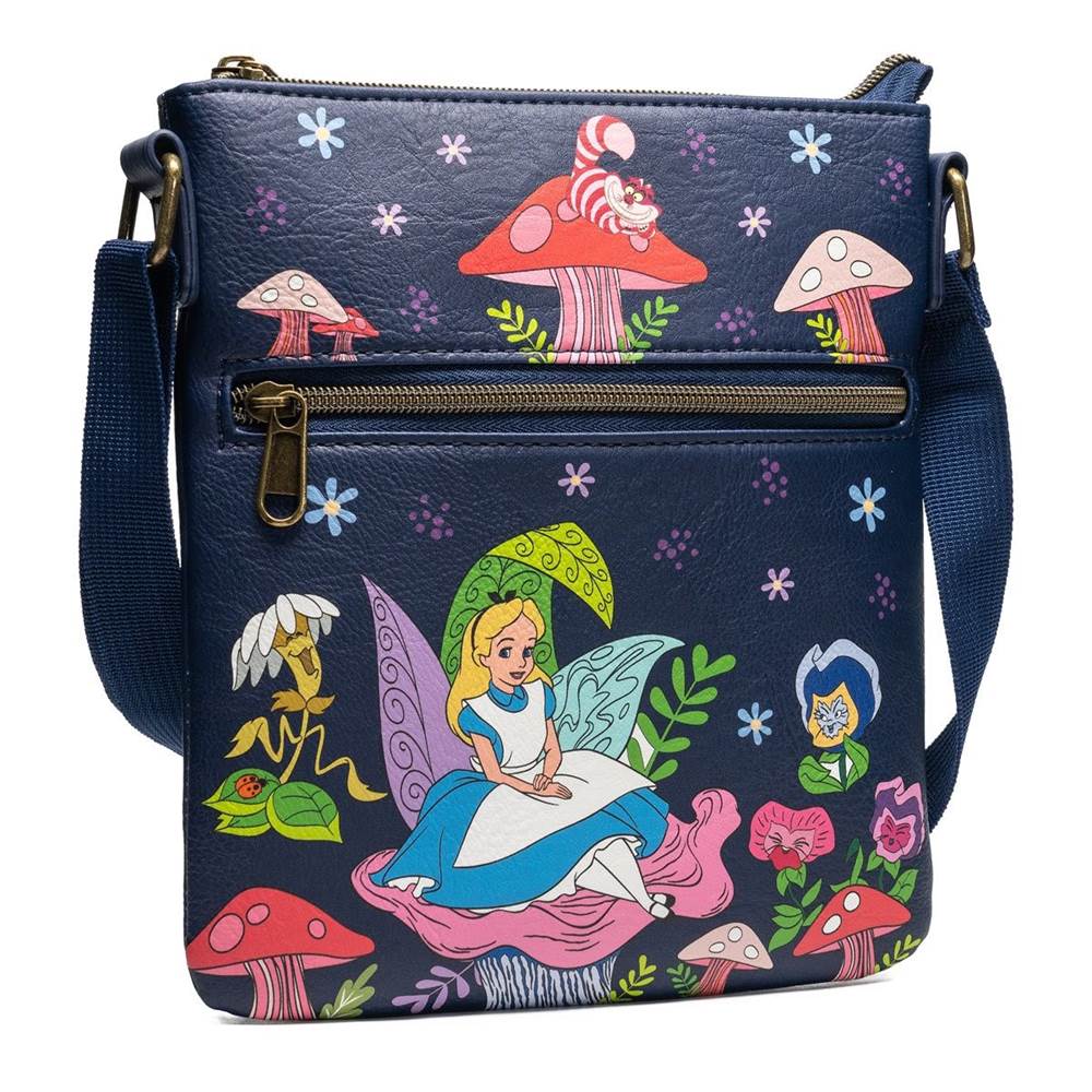 Share a magical moment with Alice, the Cheshire Cat, and all your favorite characters from the classic Disney animated film with this beautiful Alice in Wonderland Passport Bag - Entertainment Earth Exclusive! The bag displays the iconic scene where the musical flowers sing "Golden Afternoon" to Alice.