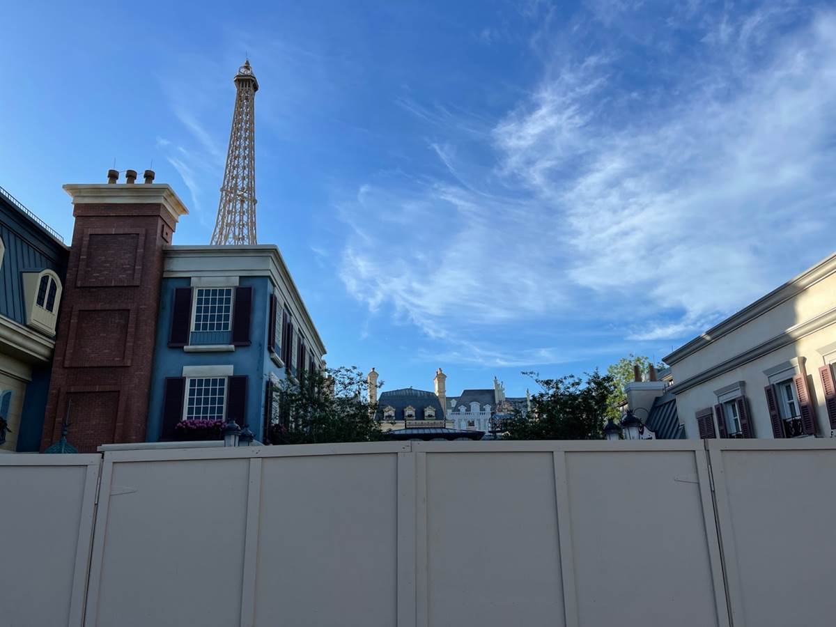 While we couldn’t take photos of what was behind the wall awaiting Guests when the attraction opens on October 1, 2021 in celebration of Walt Disney World’s 50th anniversary, Veronica did point out some details surrounding the area including the railings and benches that Guests can currently see while visiting EPCOT.