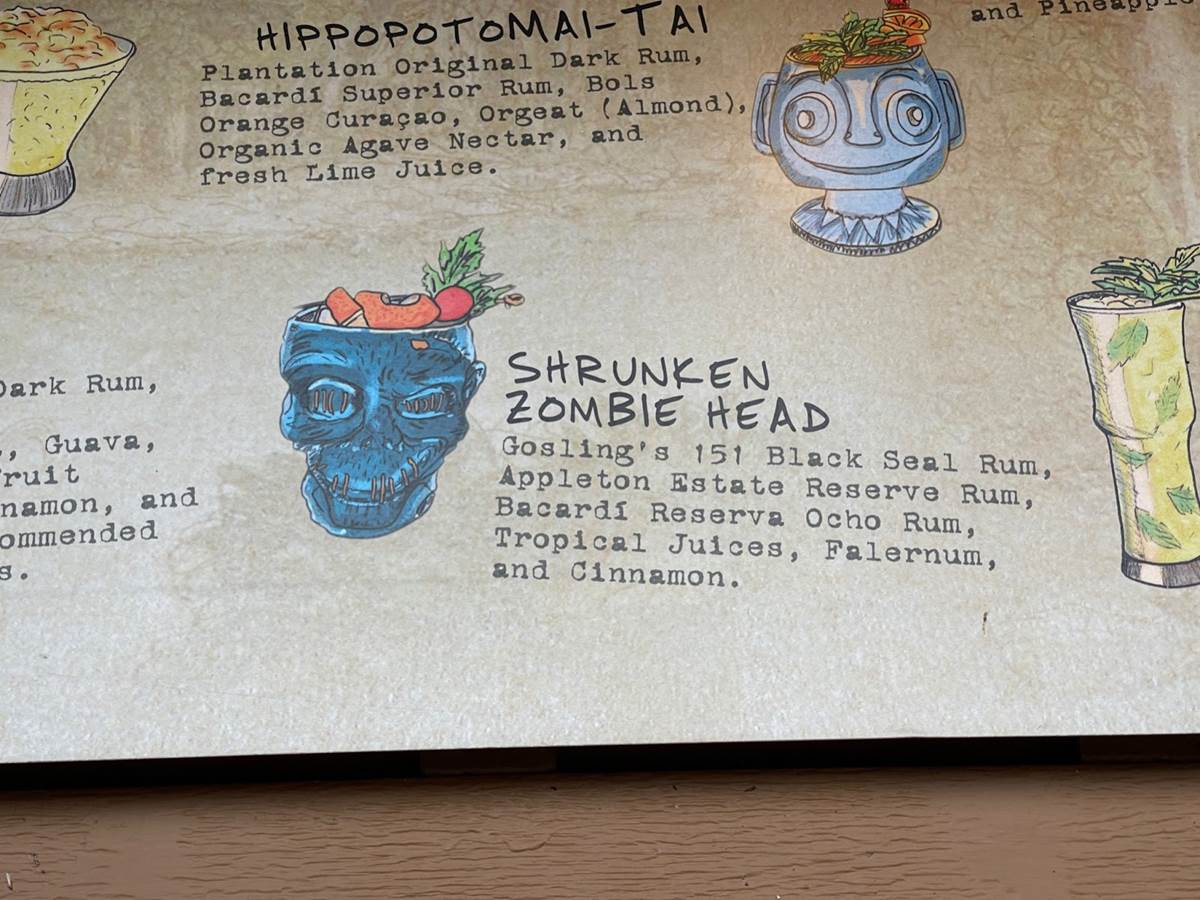 Despite the name change for the “Shrunken Zombie Head” to the new name of “Zombie,” the original name remains outdoors at the Tiki Terrace.
