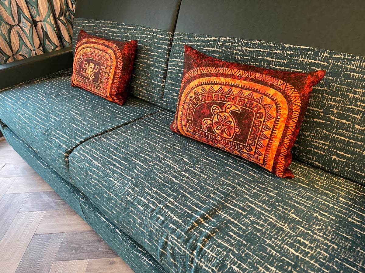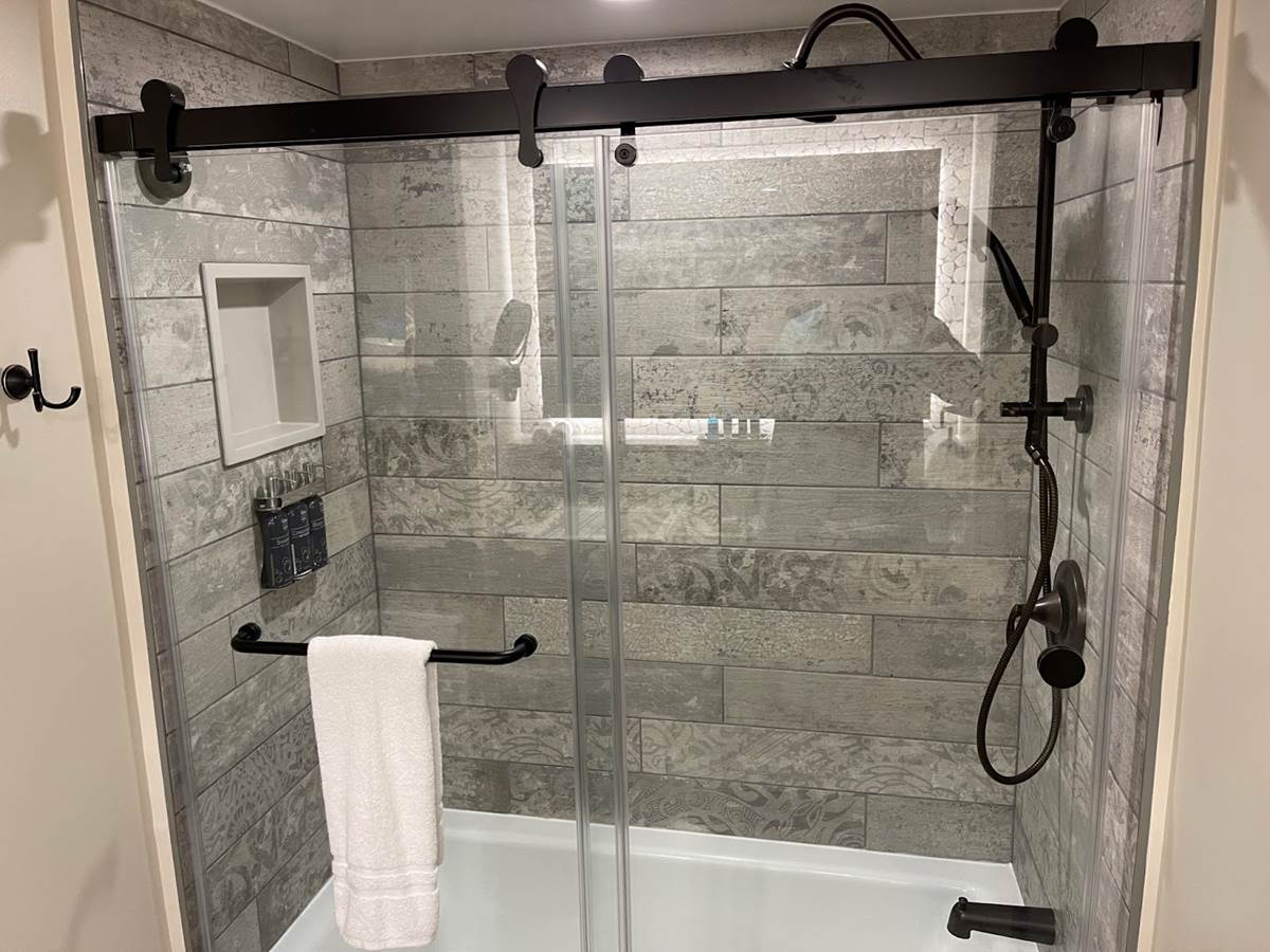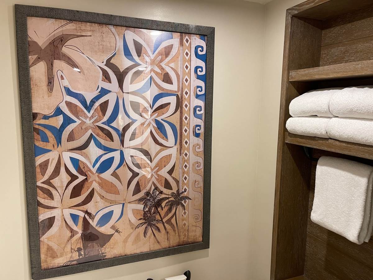 There are new furnishings and fixtures around the room including the bathroom with a “sandy ocean floor” look for the tiles.