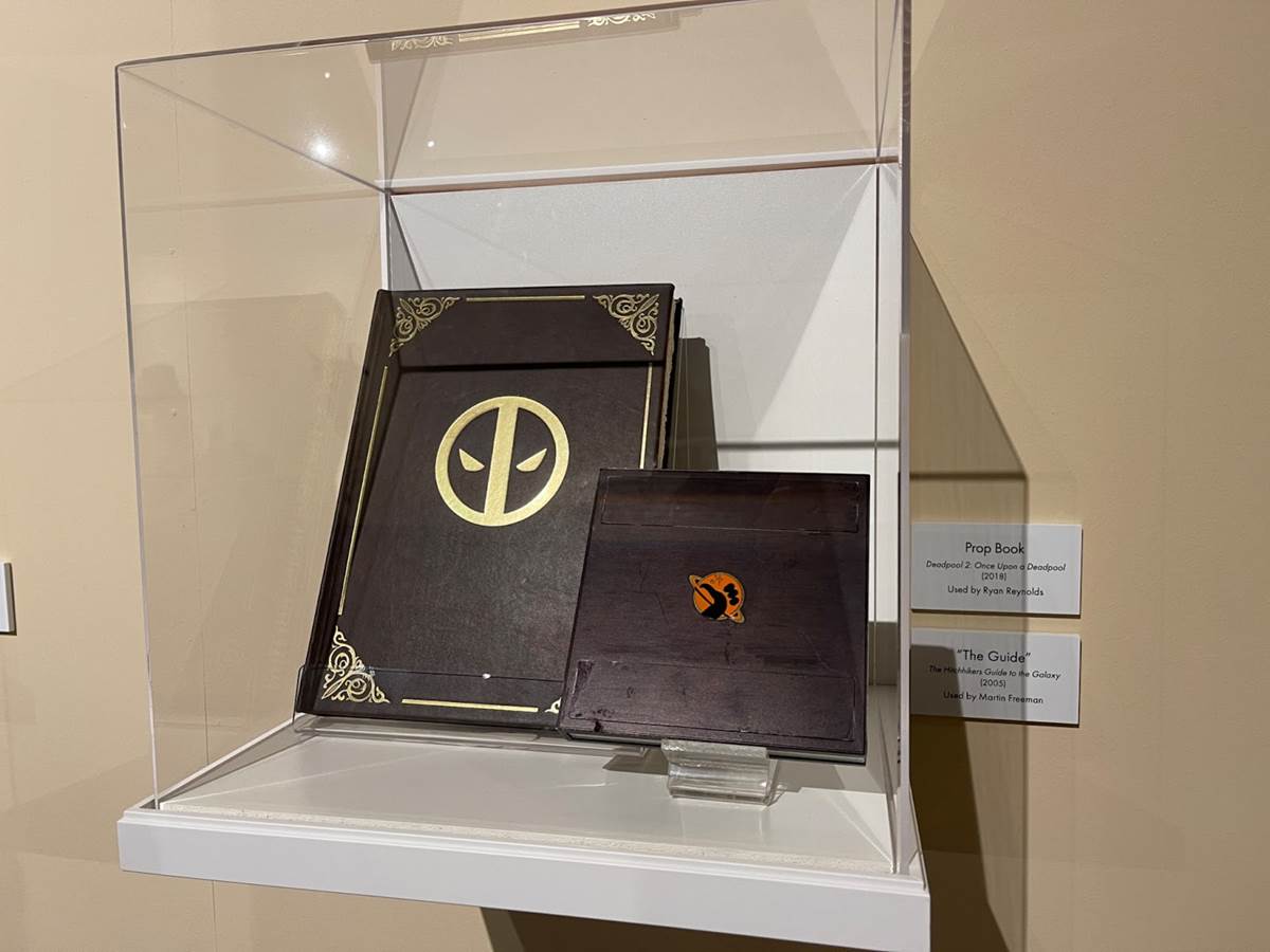 Marvel fans can check out this prop book from Deadpool 2. In the same display is “The Guide” from The Hitchhiker's Guide to the Galaxy.