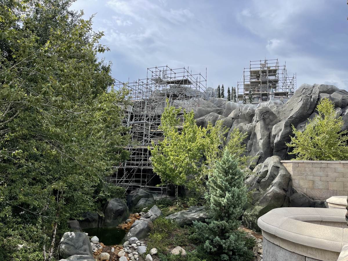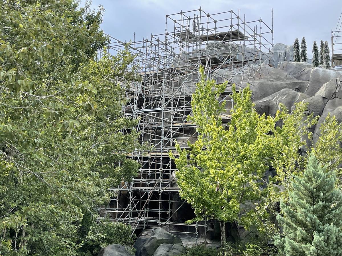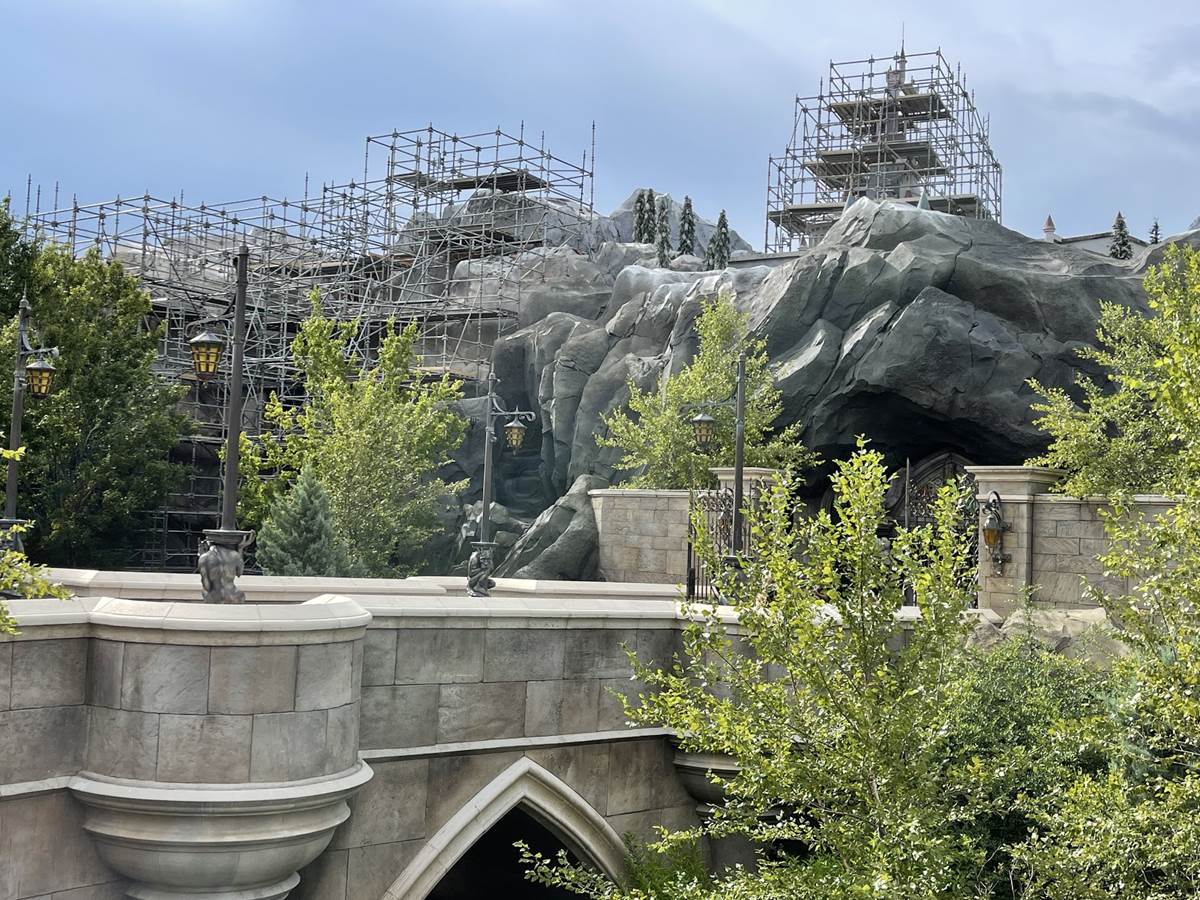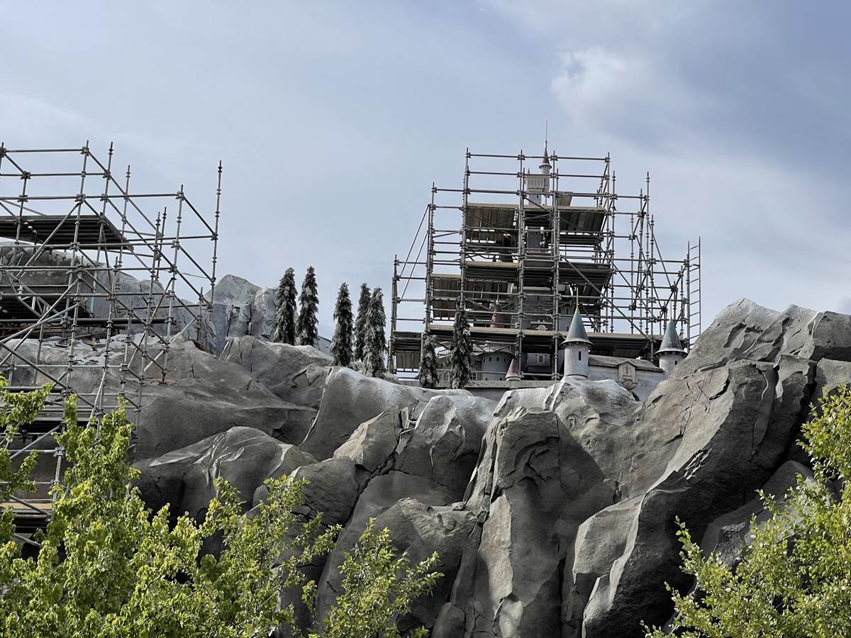 - In the photos above, you can see that scaffolding has appeared on the exterior rockwork and even the Beast’s Castle perched atop the hills and mountains of the Fantasyland skyline.