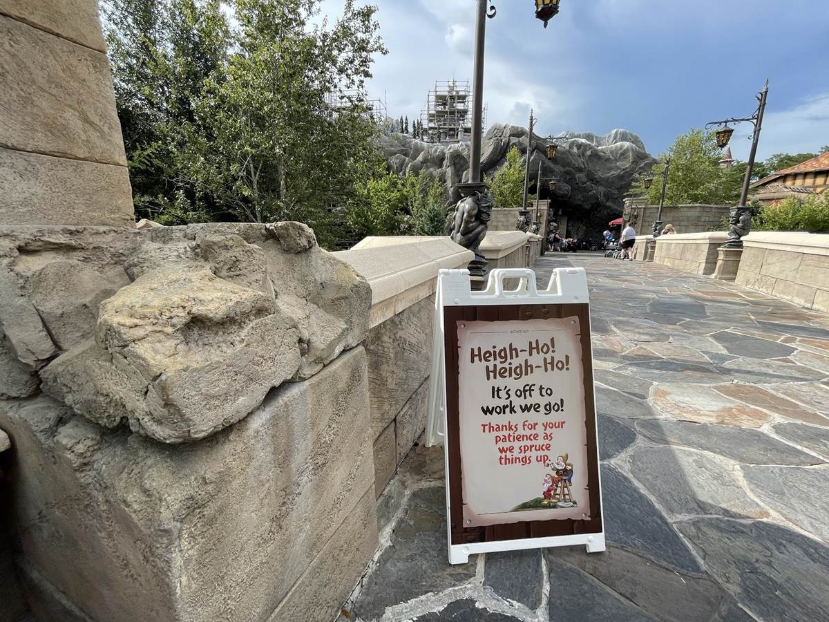 - In an amusing twist, one of the A-Frames used to apologize for the exterior appearance of the restaurant in a state of repair, is a sign with a Snow White and the Seven Dwarfs theme, likely used for work on the neighboring Seven Dwarfs Mine Train.