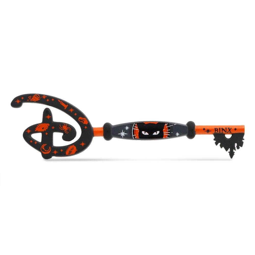 - The second and smaller key stars black cat Thackery Binx, originally a boy who’s been cursed to live this way for nearly 300 years! His key features black and orange coloring and reads “Binx” over the Castle tines.