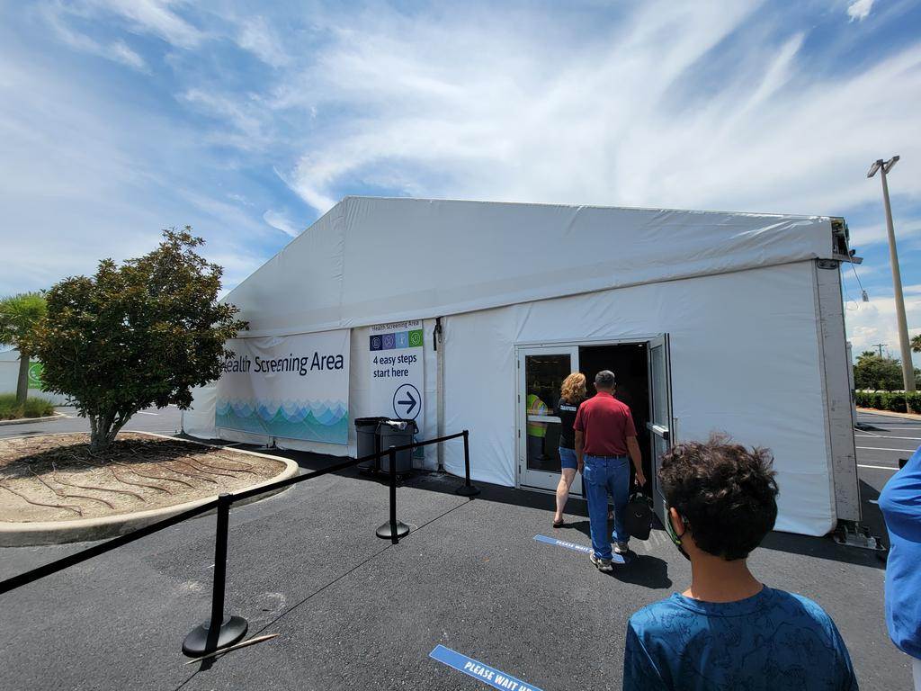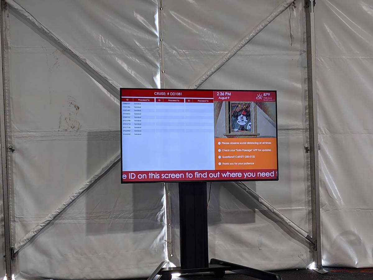 The test is self-administered and guests are moved to another tent (complete with television showing Mickey Mouse shorts) with another screen showing test results by reservation number. The process ranges from 30-45 minutes. Once cleared, guests can move to the boarding terminal. From there, the process is relatively the same with a security check, and the presentation of travel documents (passport, etc.). Most of these documents and identification photos are now uploaded through the Disney Cruise Line App but should there be any issue with any of the uploads, they can be resolved at the desk in the terminal.