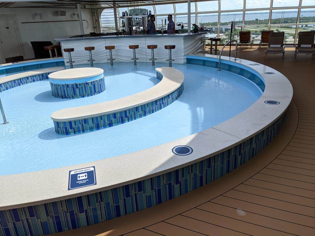 Much of what is happening on the ship is similar to what we saw when the parks and resorts of Walt Disney World first reopened last summer, with social distancing markers placed throughout so that guests keep their distance. These were found in the common areas, in pools and tables, with some tables even closed so that guests would not be that close to each other. The pool decks, once a long alley of sun chairs, are also spread out to allow for distancing.