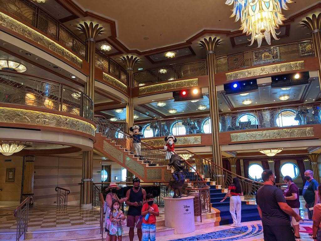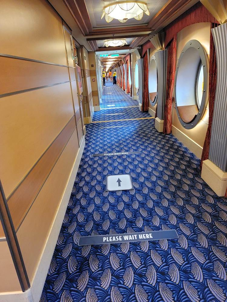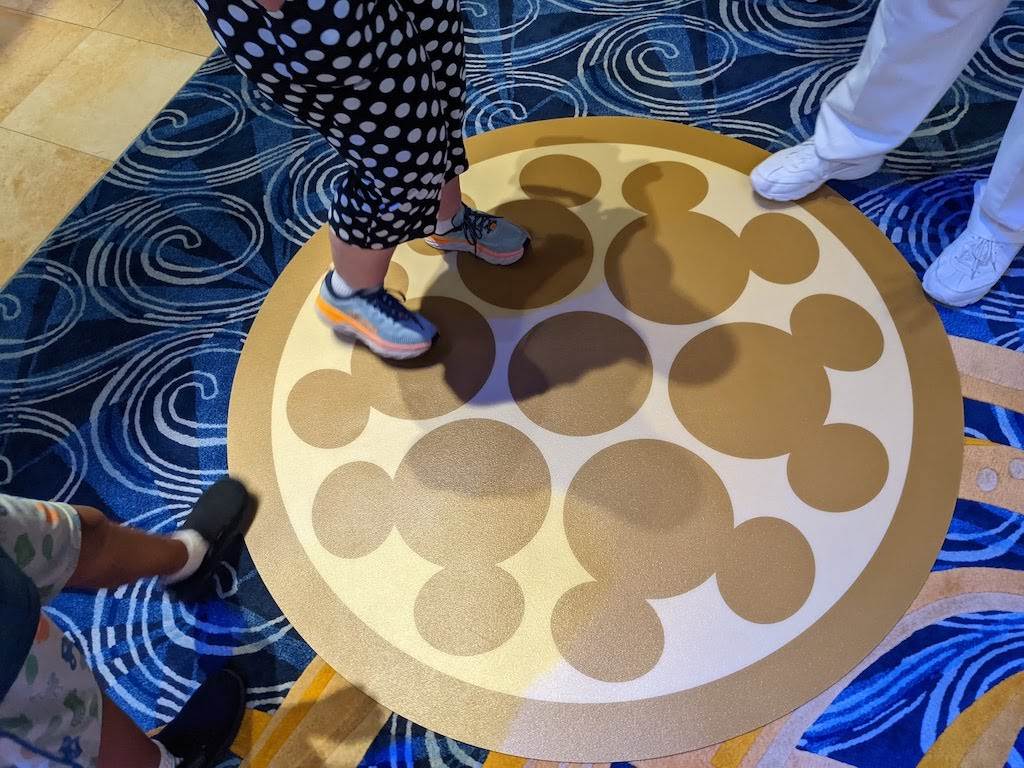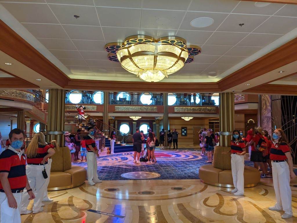 Guests are given a boarding time, promising a time in which they are welcomed aboard. Previously, this would be done en masse and groups would file onto the ship. While the more traditional welcome line is gone, there are still a number of Crew Members welcoming families aboard, and are then grouped into socially distanced circles for a brief welcome performance featuring Captain Mickey and Minnie Mouse. Based on the events listed in the schedule (or “Navigator”) this brief performance is in lieu of a Sailing Away party.