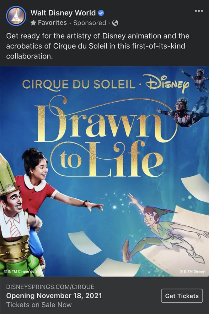 - A few days ago, an ad appeared on Facebook marketing the new Cirque du Soleil show, Drawn to Life, coming to Disney Springs November 18 with tickets on sale now.