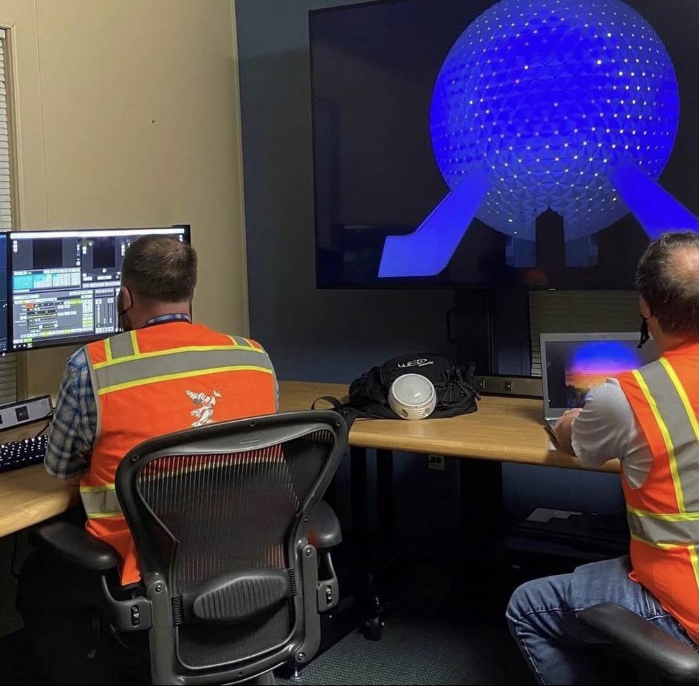 Installation of the system is nearly complete, and our team has been hard at work testing. Jason, Galen, and their team are leveraging a "pre-cueing" system to pre-visualize and program this new system virtually - allowing us to test many different ideas before locking in on our best look. And we are finding some very cool effects - giving the surface of Spaceship Earth an entirely new feeling and visual identity visible from all corners of the park.