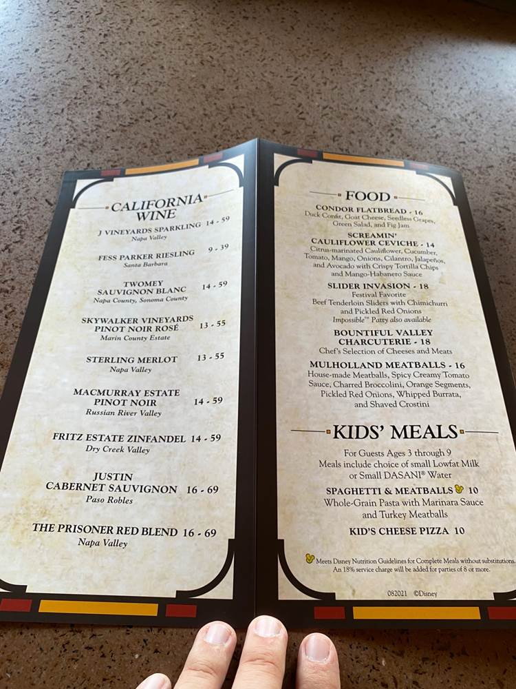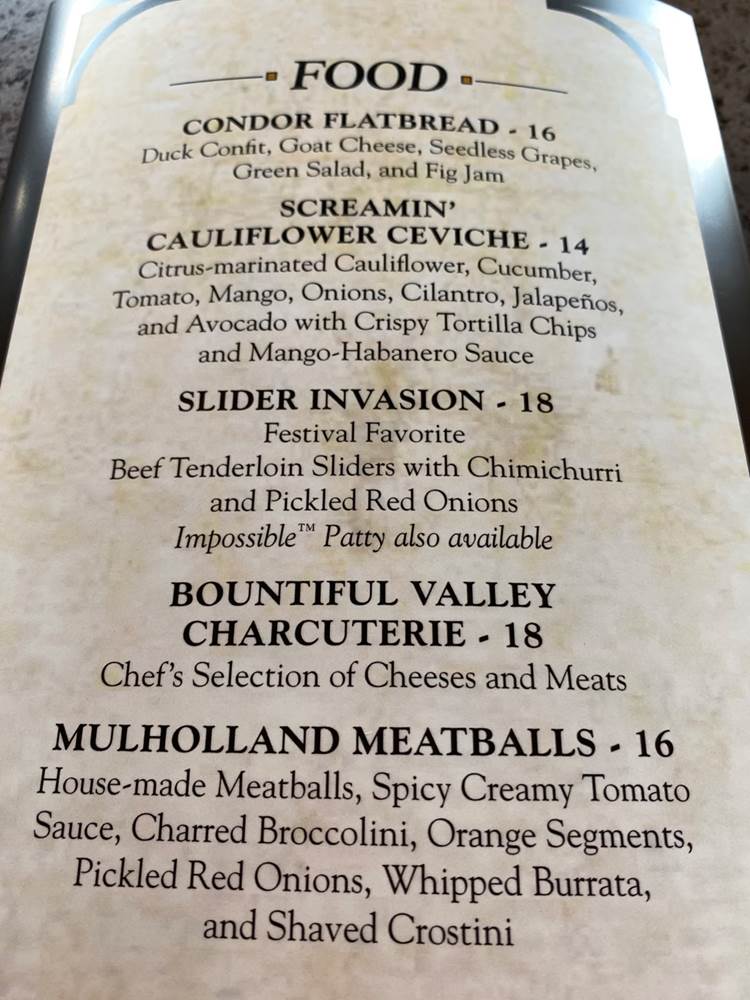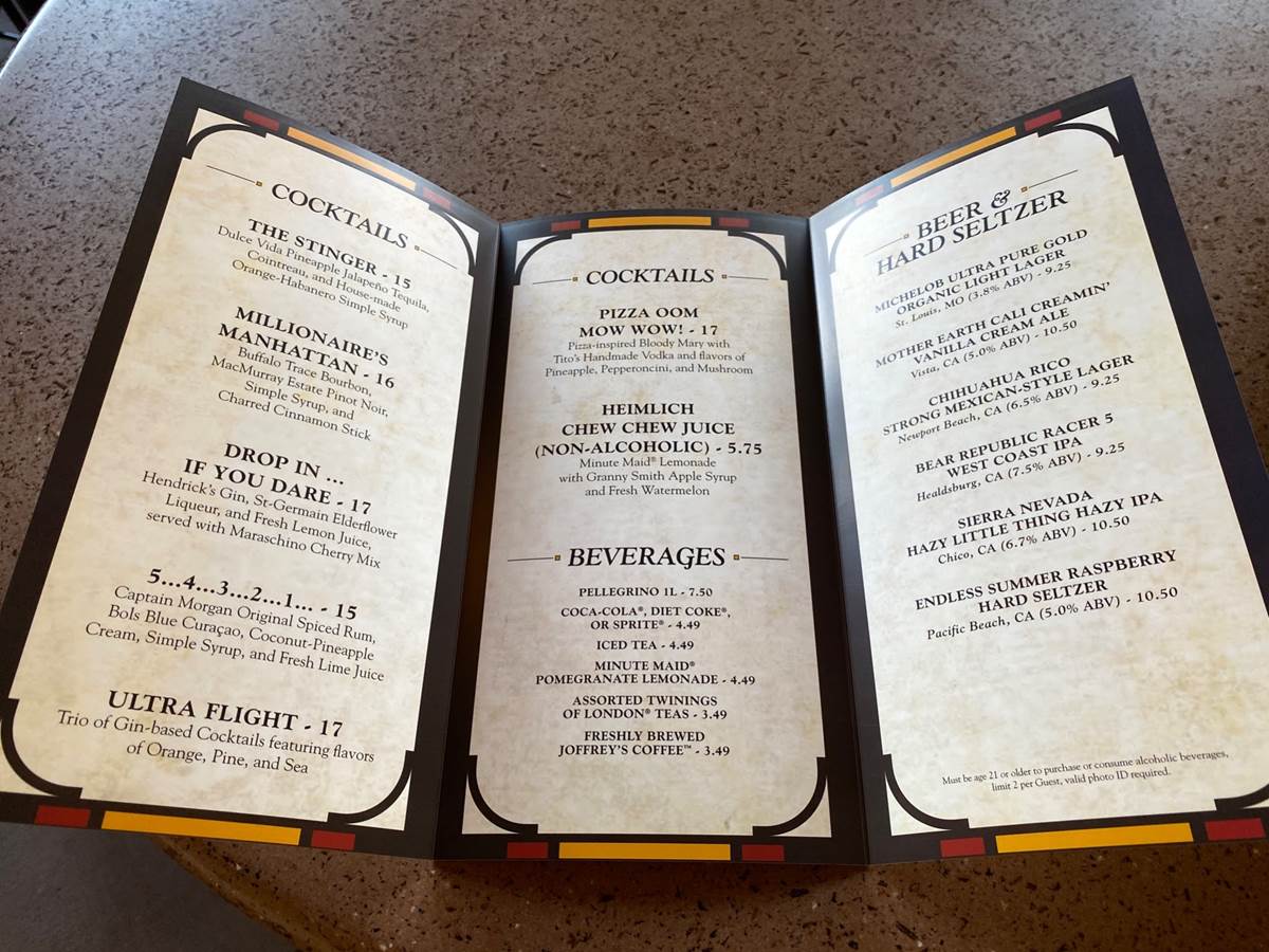 You can take a look at the menu above featuring food offerings like the Condor Flatbread and Slider Invasion, while cocktails include a non-alcoholic offering honoring the greatest ride ever created, with Heimlich Chew Chew Juice.