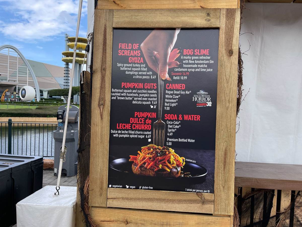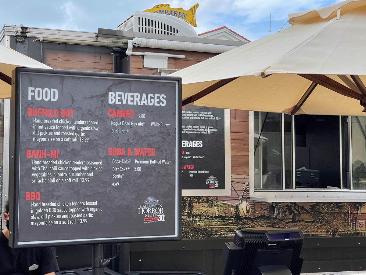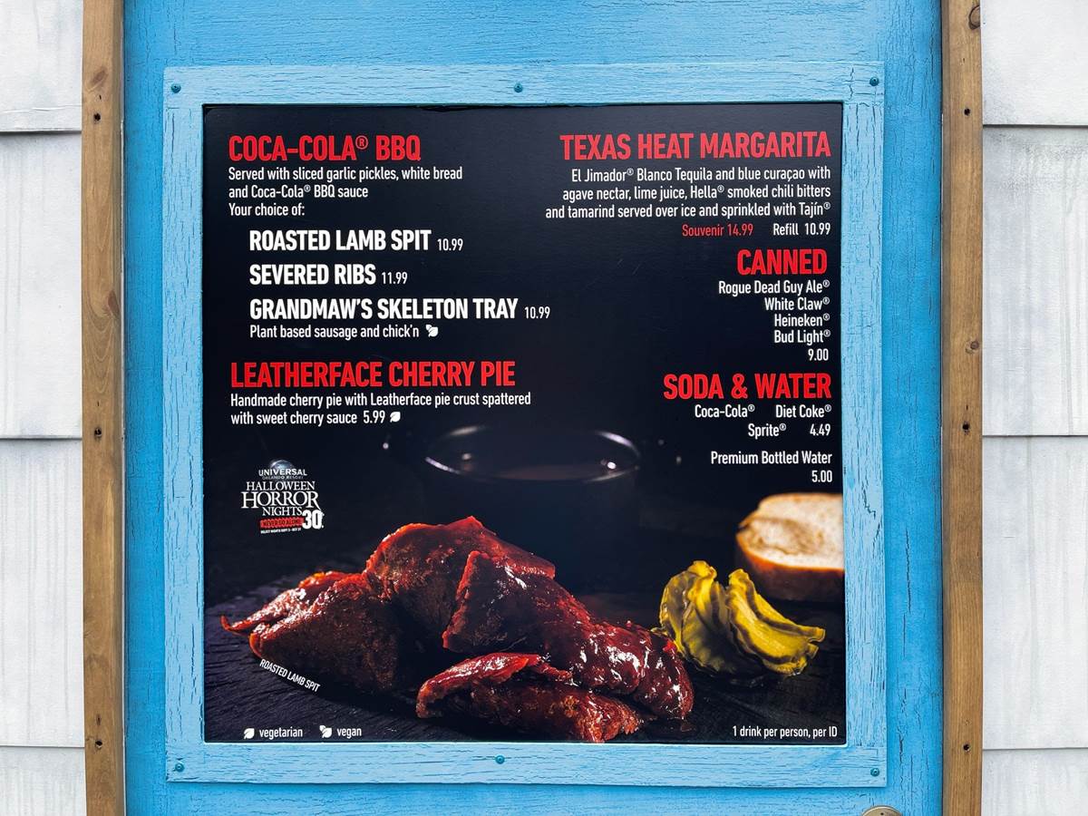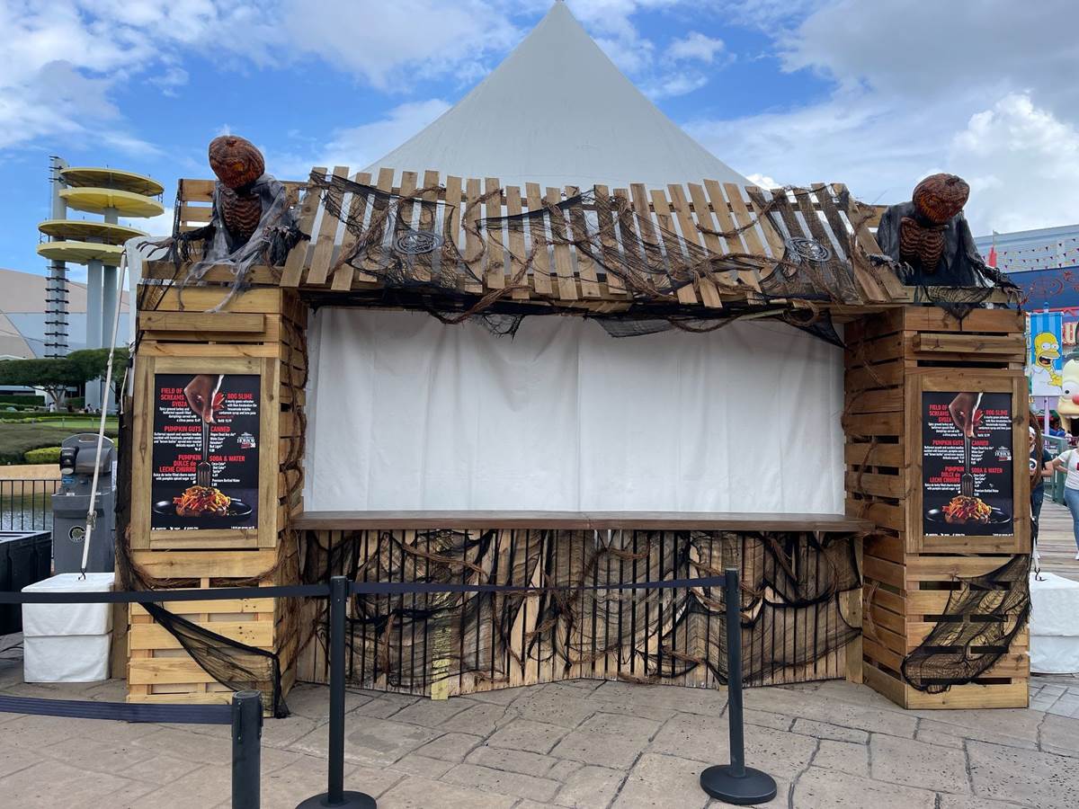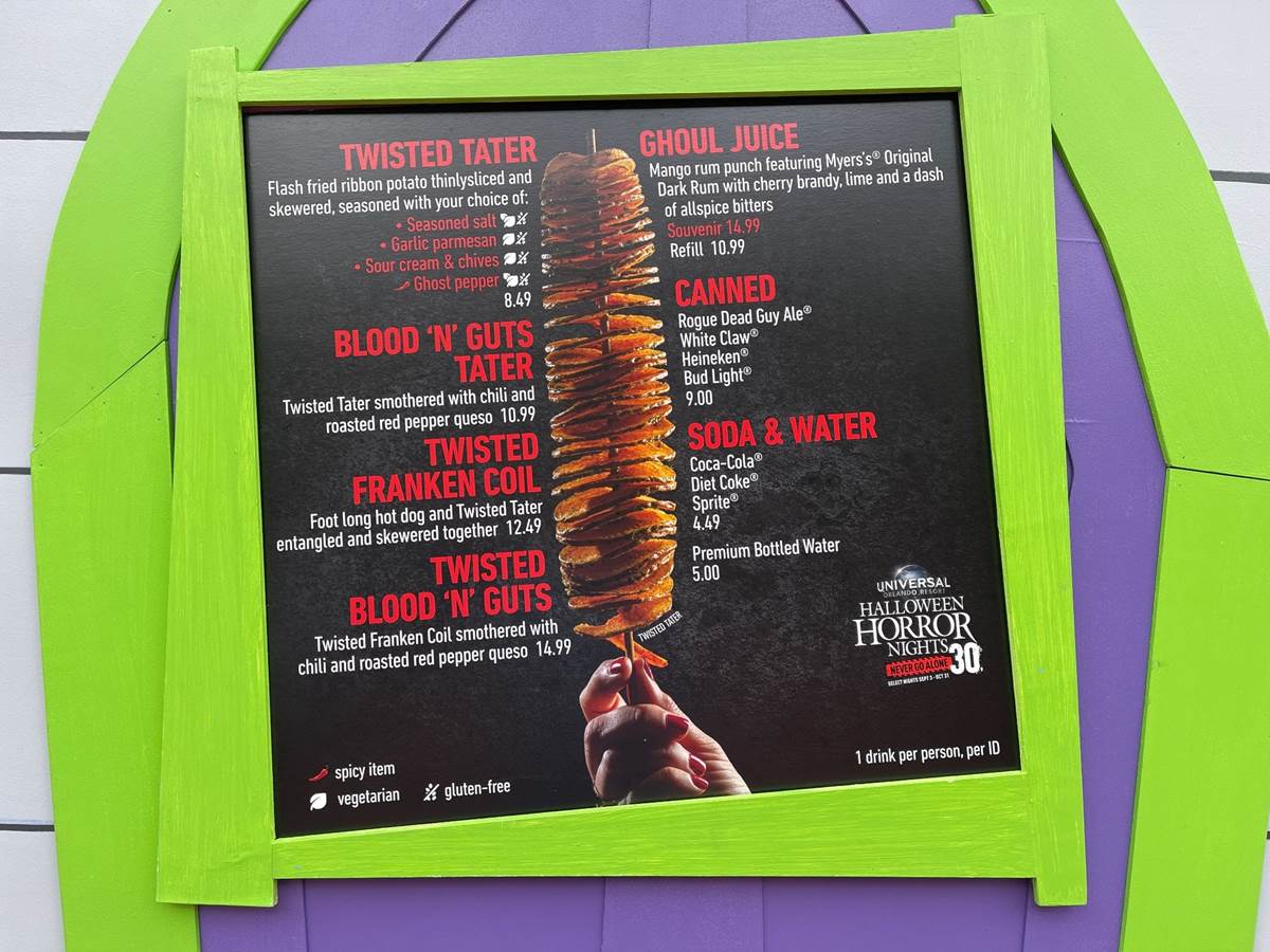 Outside of the Tribute Store, food booths have popped up around the park with their menus on display. Each booth is themed to one of the haunted houses, like Beetlejuice or Texas Chainsaw Massacre.