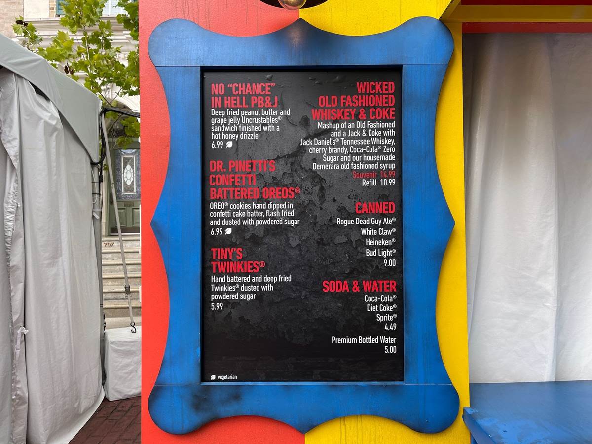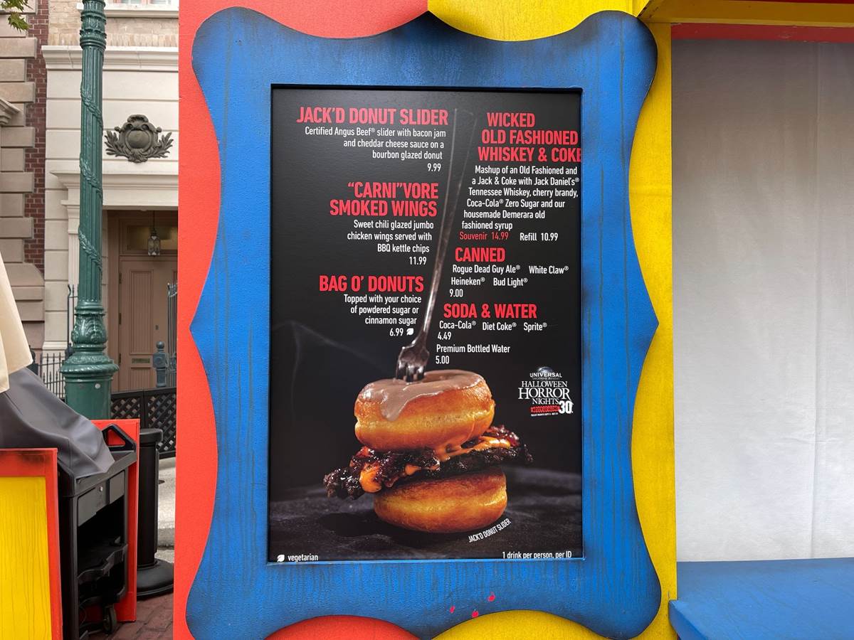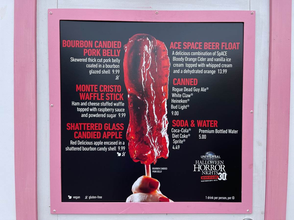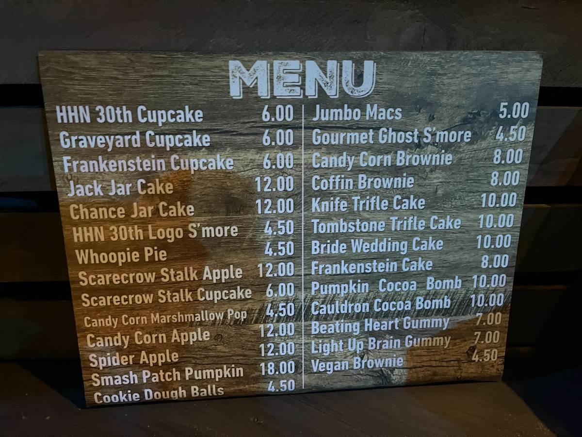 Outside of the Tribute Store, food booths have popped up around the park with their menus on display. Each booth is themed to one of the haunted houses, like Beetlejuice or Texas Chainsaw Massacre.