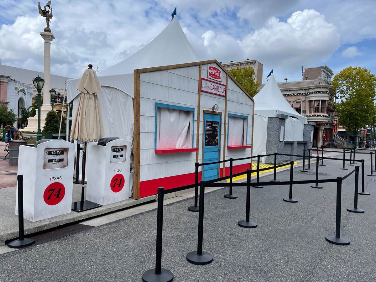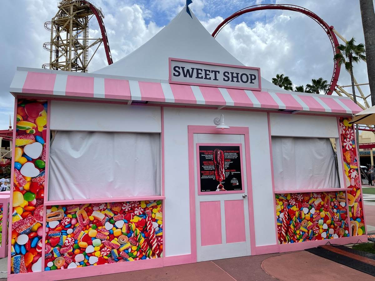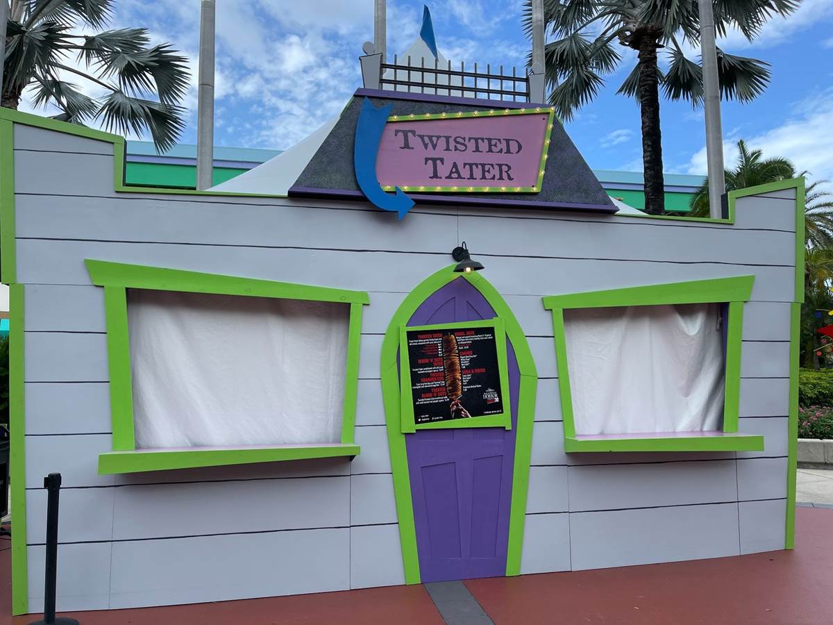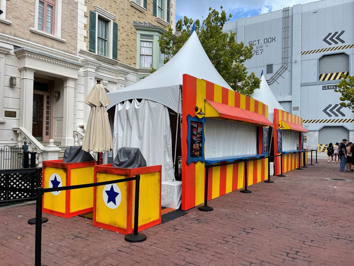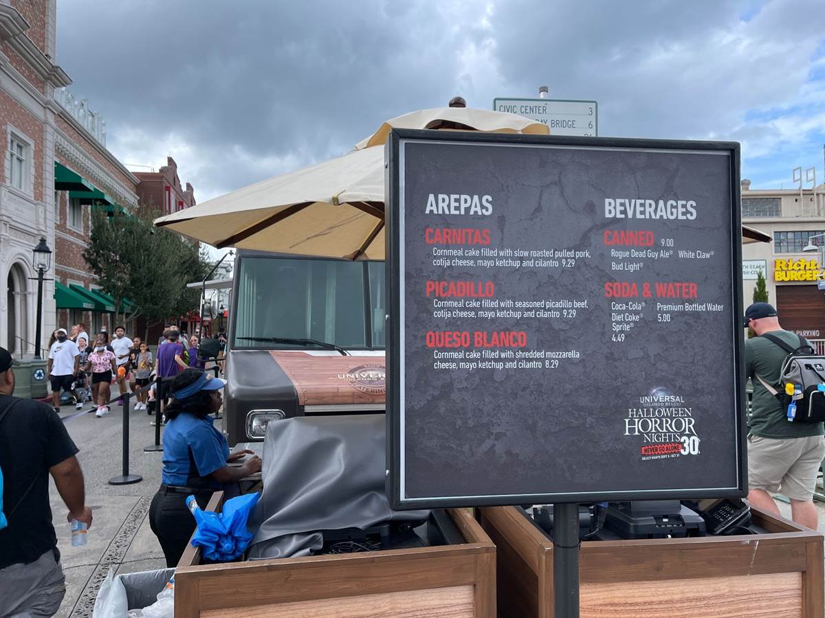 Outside of the Tribute Store, food booths have popped up around the park with their menus on display. Each booth is themed to one of the haunted houses, like Beetlejuice or Texas Chainsaw Massacre.