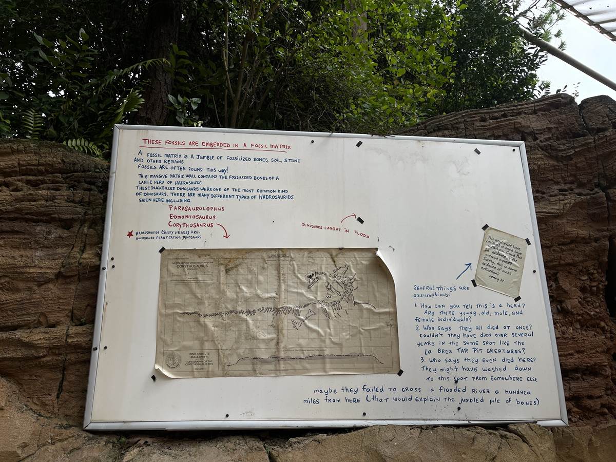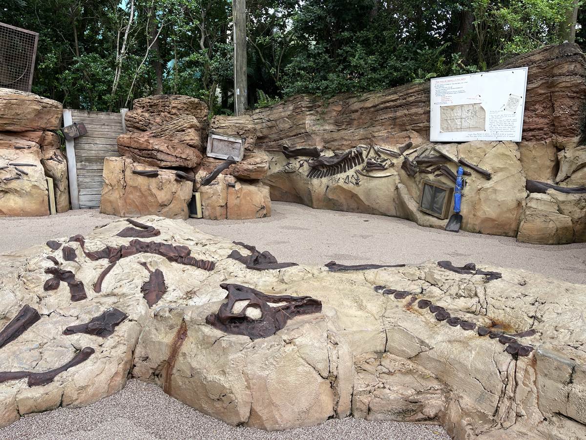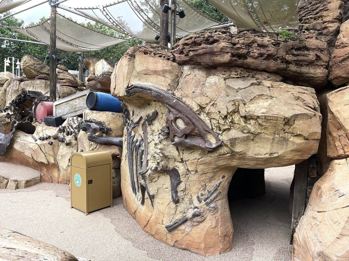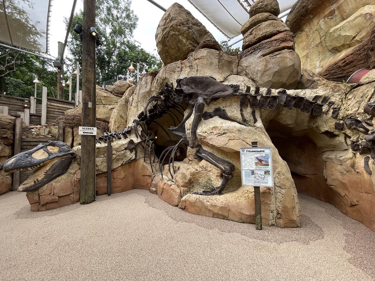 The official Walt Disney World website describes the area as “A world of prehistoric marvels [that] awaits kids ages 10 and under. [Kids] are invited to clamber across rope bridges, climb through mysterious caves and hurl down twisting slides. At the dig site, help excavate fossils from a Triceratops and a Tyrannosaurus Rex. Discover lots more dino-sized surprises as you have a blast digging up the past. Parents of busy explorers can enjoy a shaded seating area at the dig site, where large fans help cool things down.