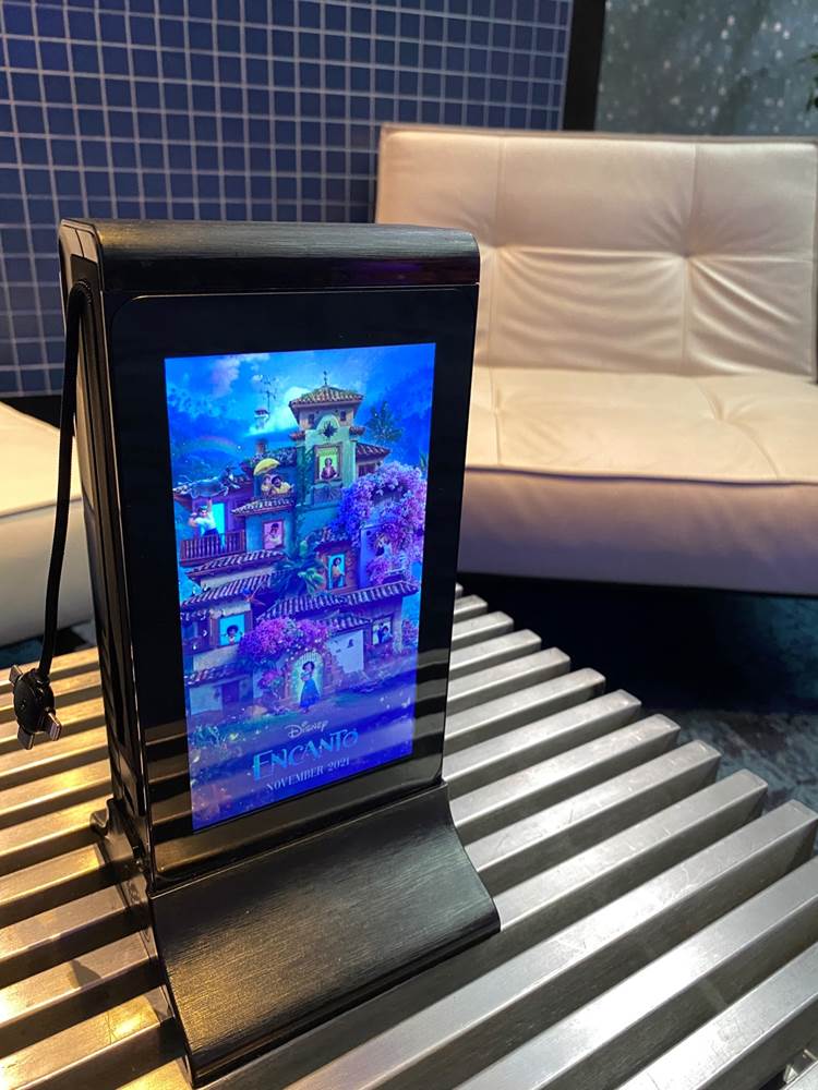 Charging stations are also available, with plugs located on the side that feature ads for upcoming films like Encanto, and Ron’s Gone Wrong.