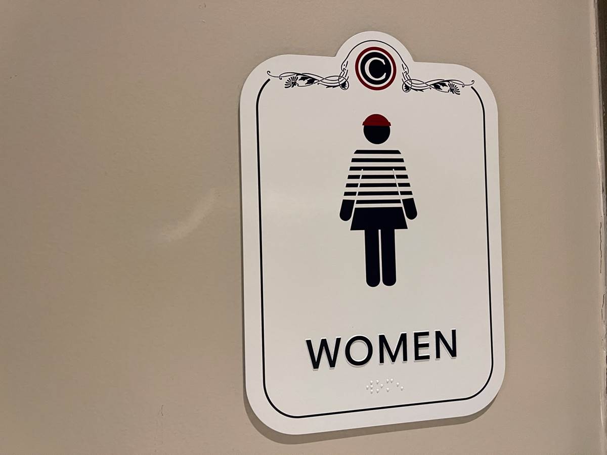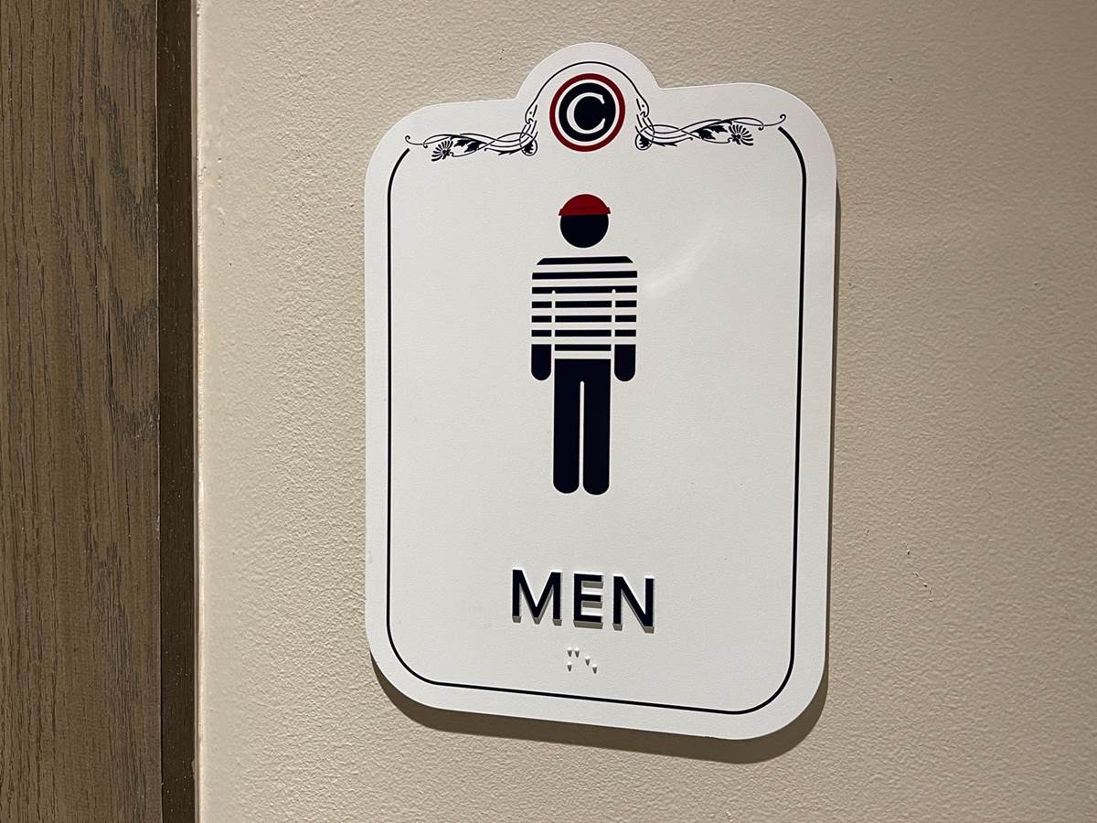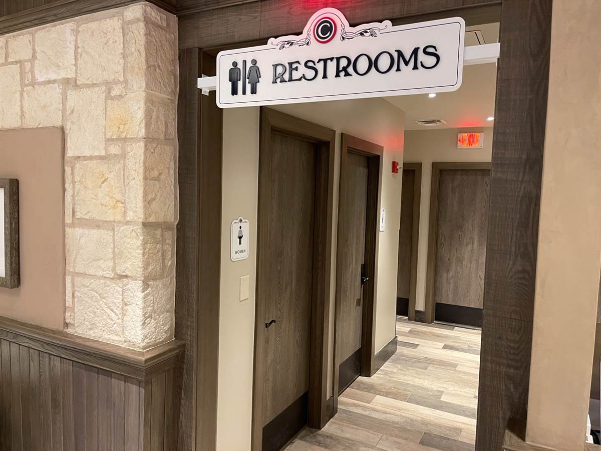 - Aside from the food, the restaurant features themed signage for the restrooms.