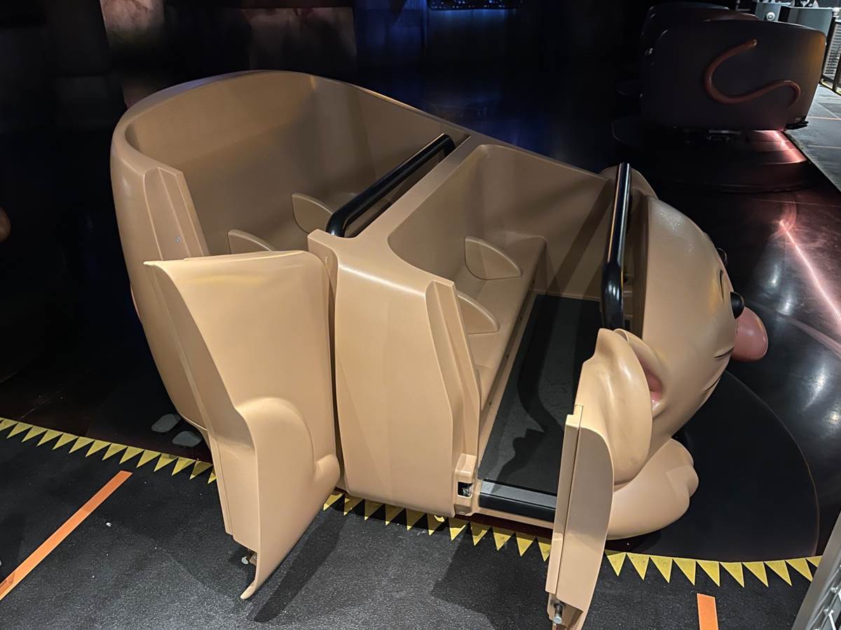 - The attraction uses trackless vehicles as Guests travel in groups of three, moving forward, backward, spinning, tilting, and bouncing along from scene to scene.