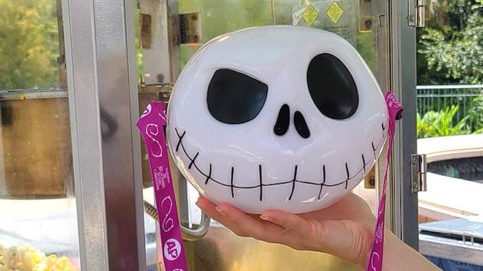 - The bucket, shaped like Jack Skellington from Tim Burton’s The Nightmare Before Christmas, sells for $20.00 and features a purple strap with patterns similar to those in the film, as well as the movie’s logo alongside the Annual Passholder AP stamp featuring the iconic mouse ears pattern in the “P” of “AP.”
