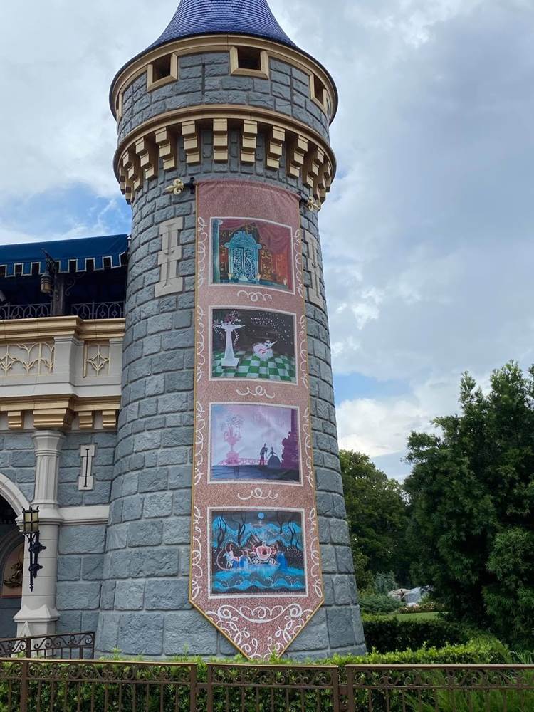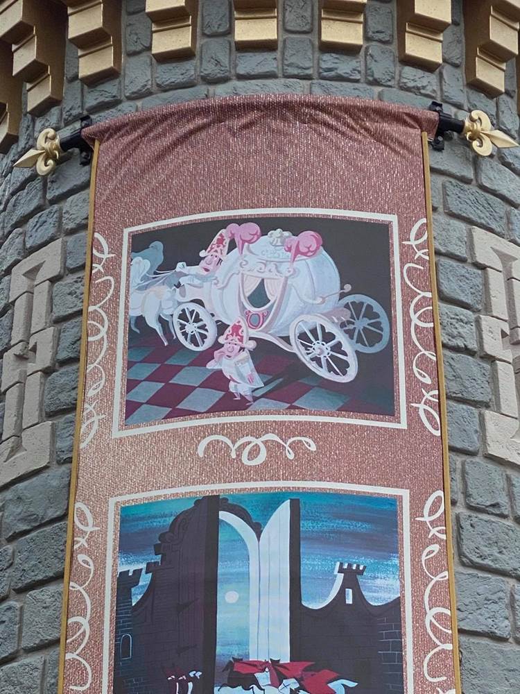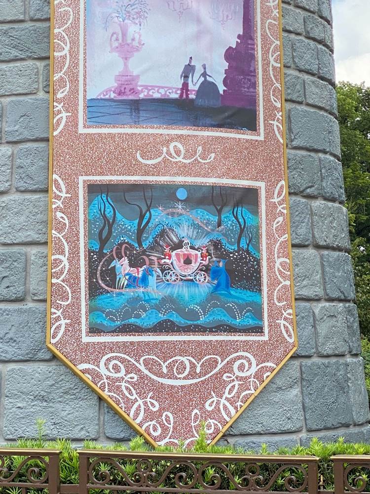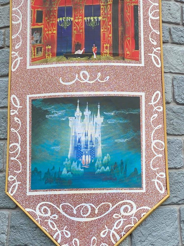 - New tapestries have been hung from the turrets surrounding the Cinderella Castle Forecourt at Walt Disney World’s Magic Kingdom showcasing various concept art, most of which done by Disney Legend Mary Blair, that was used for the development of Walt Disney Animation Studios’ Cinderella.