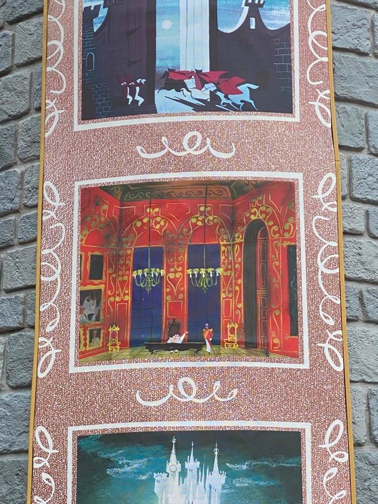 - The art, now presented as banners adorning the castle turrets, showcases the development of how scenes would look in the film, each one of them becoming a memorable moment to fans of the classic movie. The art also has that Mary Blair signature look to it, a bold and ground-breaking color design by using primary colors to form intense contrast and colors that are unnatural to the image they are depicting, a look that still inspires many of today's animators and park designers.