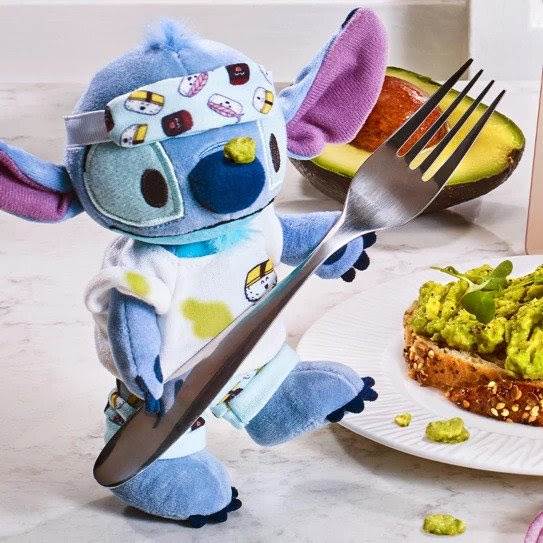 - As seen above, it looks like Stitch is enjoying Avocado Toast for brunch, but the fun part here is his outfit. He’s dressed in pajamas and a sleep mask that features different types of nigiri sushi and possibly some wasabi.