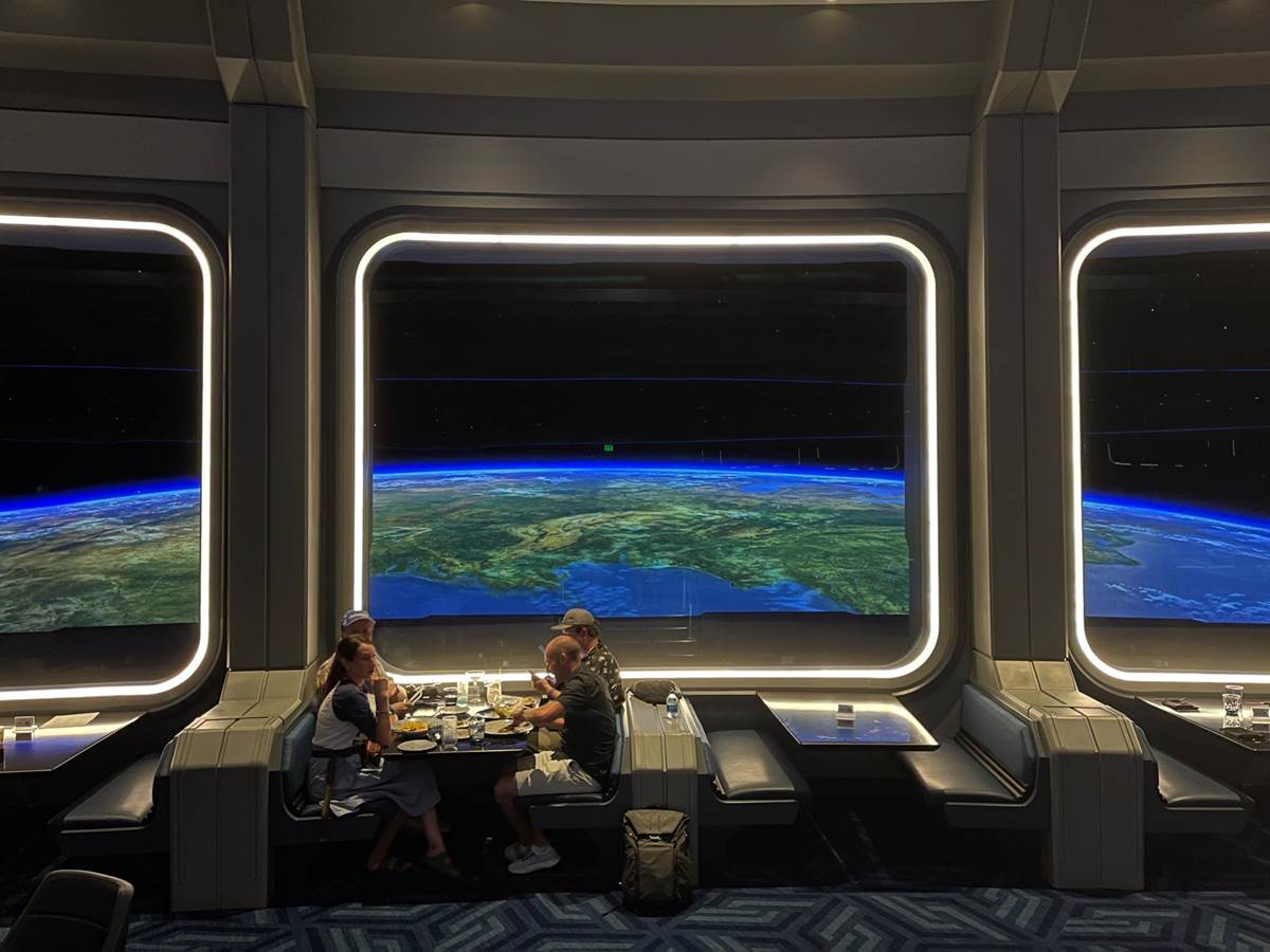 Once docked, you will head to the Centauri Space Station-themed dining area, featuring panoramic views of Earth along with a variety of work and leisure activities taking place outside.